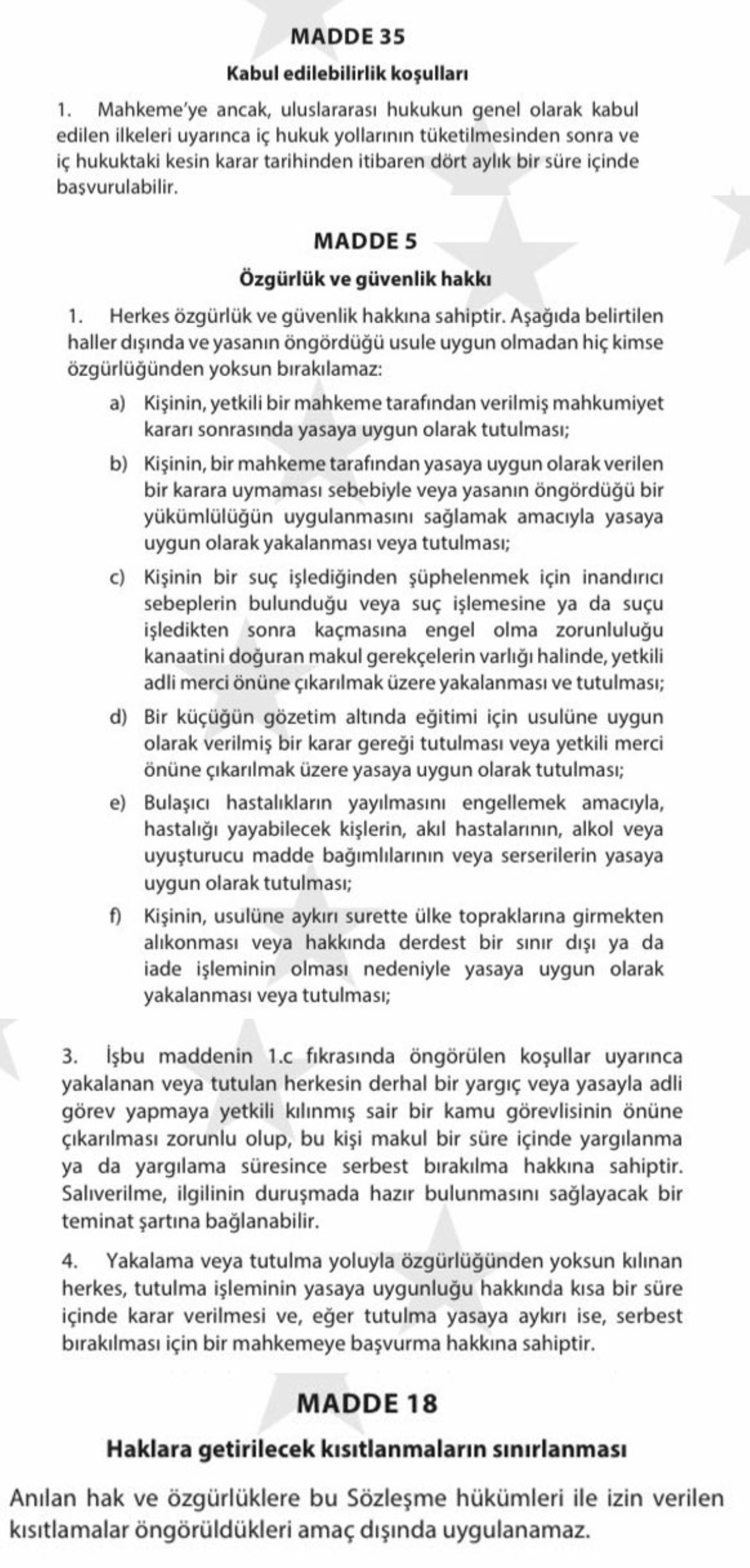 5. Devletin bu davada, Sözleşme’nin 5. maddesi uyarınca olduğu iddia edilen kısıtlamaları, bu hükümlerin öngördüğü amaç dışında bir amaçla uygulaması, **Sözleşme’nin 18. maddesine** aykırı mıdır? (Bkz. *Rasul Jafarov v. Azerbaycan*, no. 69981/14, §§ 153-163, 17 Mart 2016 ve *Selahattin Demirtaş v. Türkiye (no. 2)* [Büyük Daire], no. 14305/17, §§ 421-438, 22 Aralık 2020)