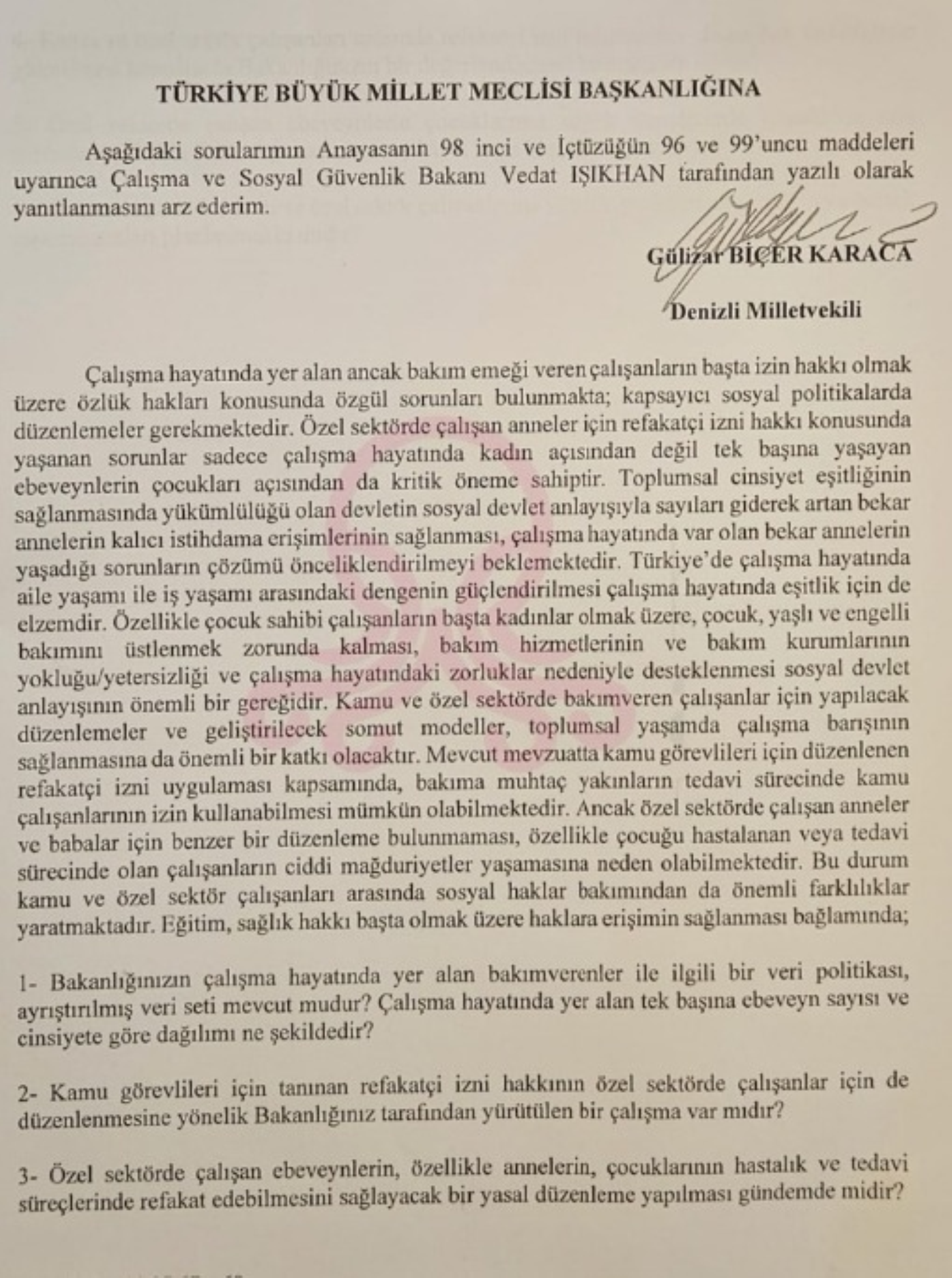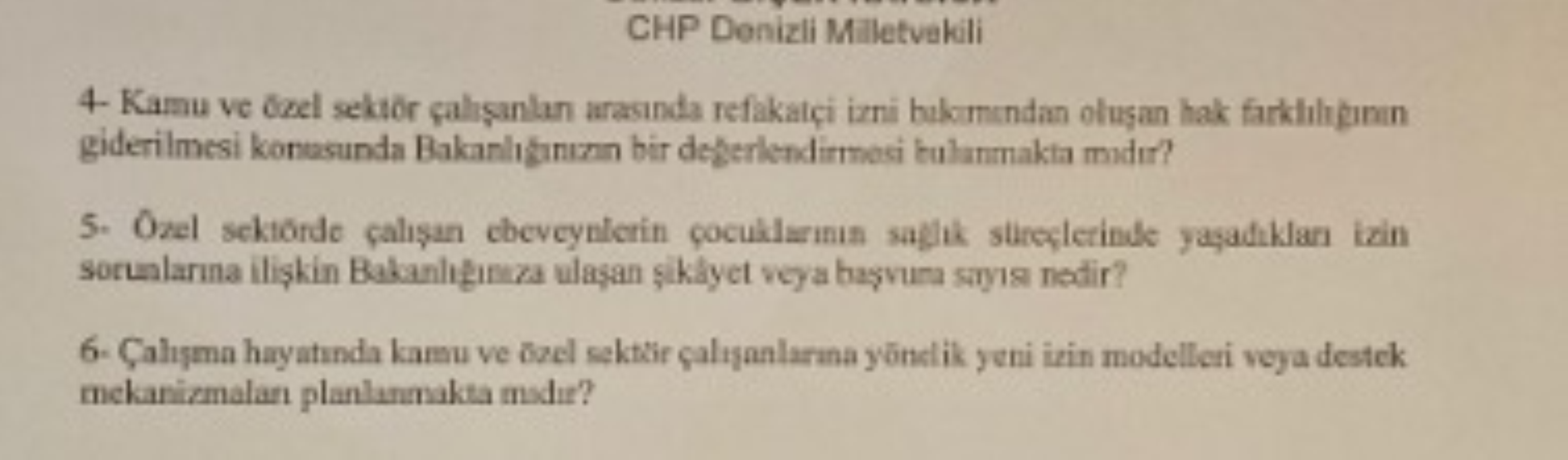 Konuyla ilgili olarak Çalışma ve Sosyal Güvenlik Bakanı Vedat Işıkhan’ın yanıtlaması istemiyle Türkiye Büyük Millet Meclisi’ne soru önergesi iletildi.