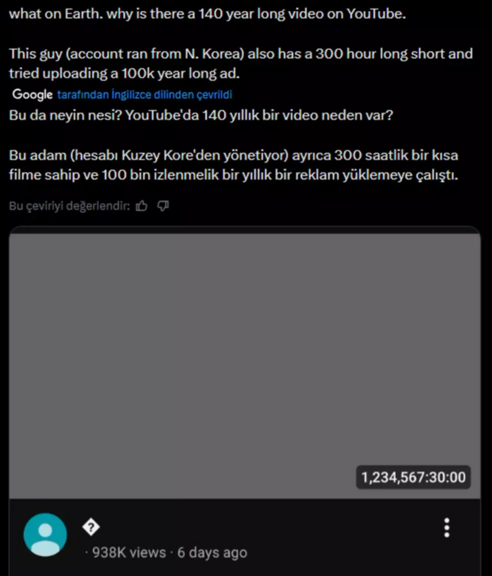 Dijital platformlarda zaman zaman sıra dışı ve gizemli paylaşımlar ortaya çıkarken, YouTube’a yüklenen yeni bir video bu tartışmaları yeniden alevlendirdi. Kuzey Kore merkezli olduğu öne sürülen bir kanal tarafından paylaşılan ve 140 yıl uzunluğunda olduğu belirtilen video, son günlerde sosyal medyada geniş yankı uyandırdı.