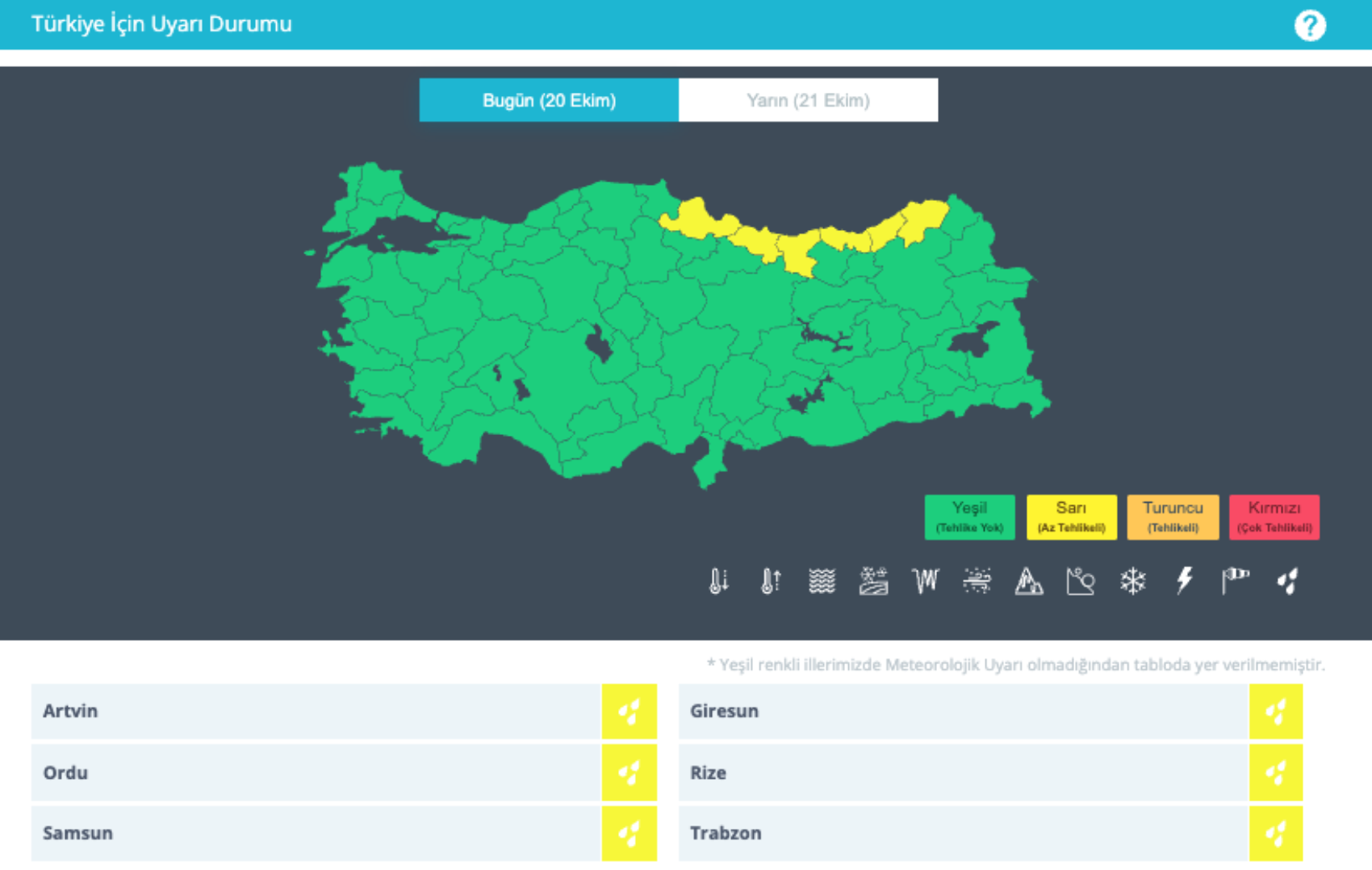 MGM’nin raporunda Trabzon, Rize, Samsun, Ordu, Giresun ve Artvin için sarı kodlu uyarıda bulunuldu.