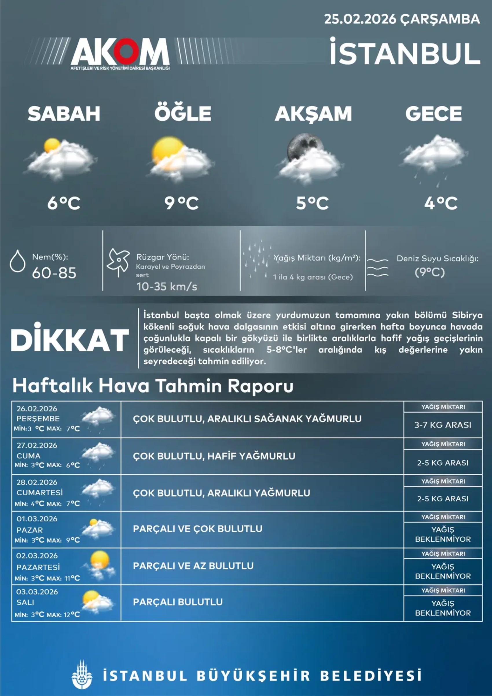 AKOM'dan yapılan açıklamaya göre hava sıcaklıklarının önümüzdeki günlerde 5 ile 8 derece bandında seyretmesini bekleniyor. Sıcaklıkların hafta boyunca yüksek seviyelere ulaşmayacağı, kış değerlerinin korunacağı ifade edildi. Özellikle Çarşamba günü başlayan yağışların şehir genelinde etkili olacağı dile getirildi.