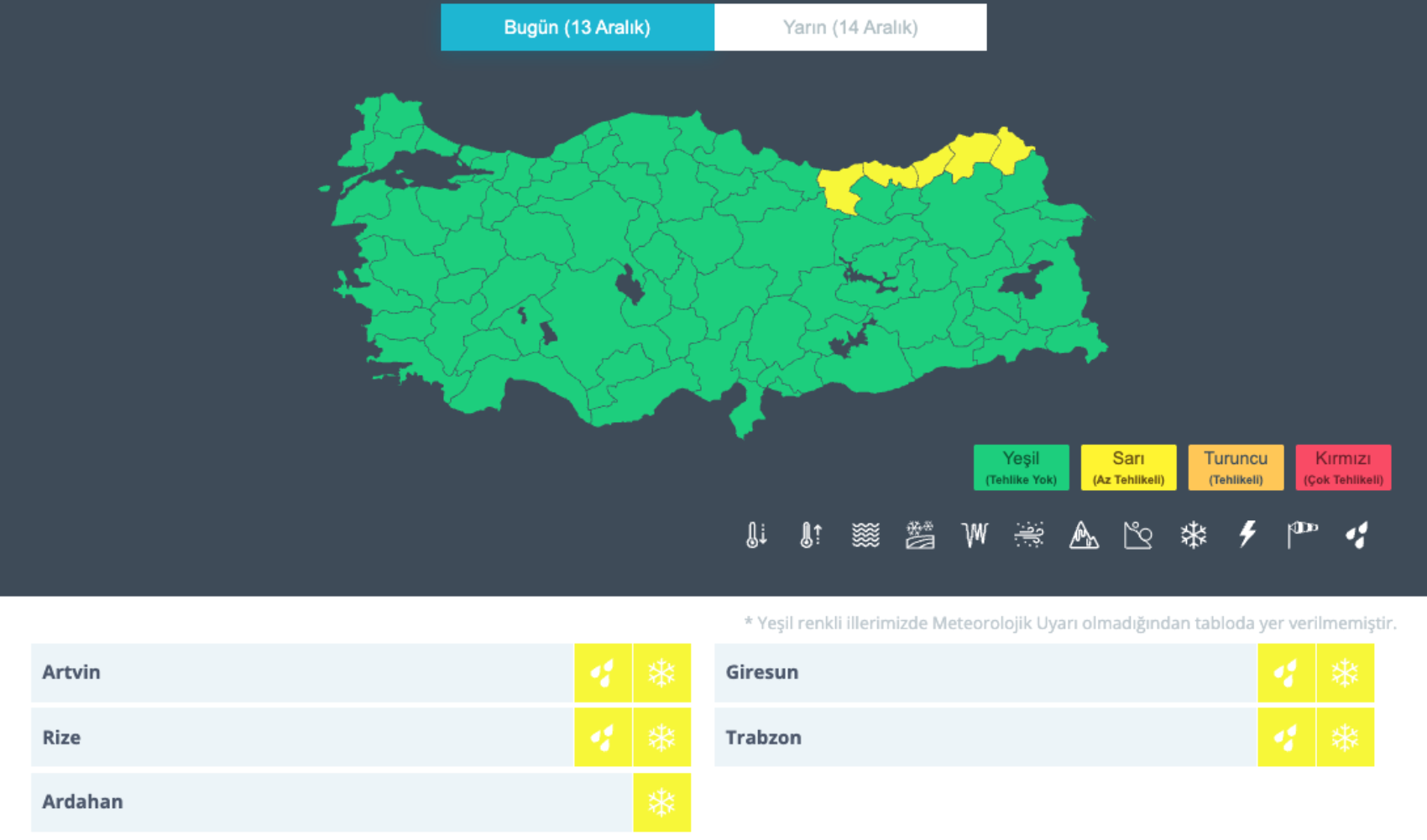 MGM’nin raporunda Trabzon, Rize, Giresun, Artvin ve Ardahan için sarı kodlu uyarıda bulunuldu.