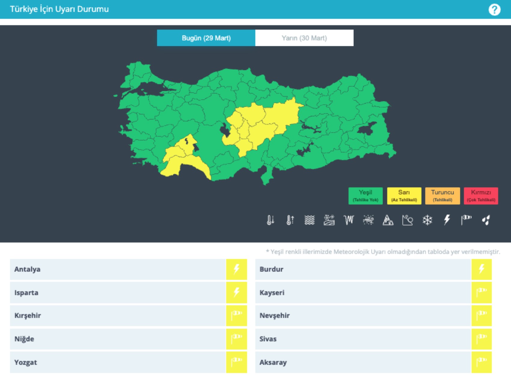 Meteoroloji’nin raporunda Antalya, Burdur, Isparta, Kayseri, Kırşehir, Nevşehir, Niğde, Sivas, Yozgat ve Aksaray için sarı kodlu uyarı yapıldı.