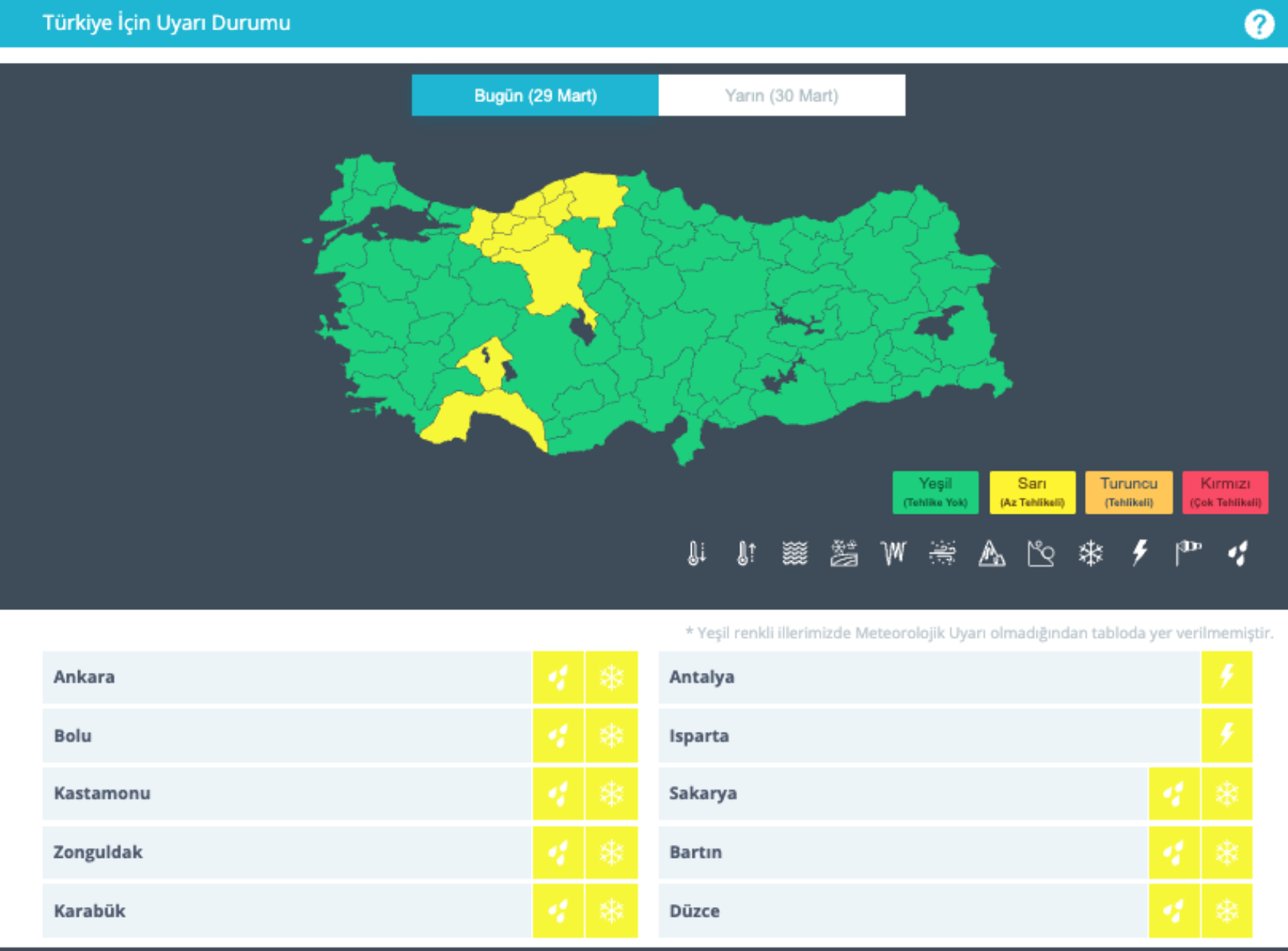 Meteoroloji Genel Müdürlüğü'nün 29 Mart hava durumu tahmin raporunda 10 kent için sarı kodlu uyarı yapıldı; yurt genelinde yağmur ve sağanak beklenirken, Ege ve Akdeniz kıyılarında yer yer gök gürültülü sağanak görülecek, iç ve doğu kesimlerin yükseklerinde ise karla karışık yağmur ve kar etkili olacak. Ege, Akdeniz, Marmara’nın doğusu, Batı Karadeniz’in batısı ile Adıyaman ve Elazığ çevrelerinde yağışların kuvvetli olması beklenirken, bazı bölgelerde 50-80 km/saat hızında fırtına görülecek; Doğu Karadeniz ve Doğu Anadolu’nun yüksek kesimleri için çığ tehlikesine karşı da uyarı yapıldı. Peki, bugün yurt genelinde hava nasıl olacak? İşte il il 29 Mart Pazar hava durumu...