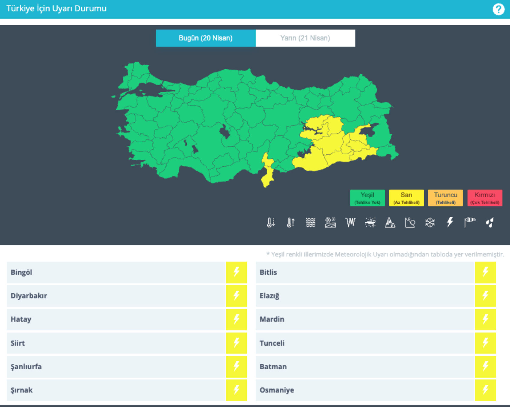 Meteoroloji Genel Müdürlüğü tarafından yapılan son değerlendirmelere göre: Ülkemiz genelinin parçalı ve çok bulutlu, Doğu Akdeniz'in kuzey ve doğusu, Doğu Karadeniz, Doğu ve Güneydoğu Anadolu ile Ordu çevrelerinin aralıklı yağmur ve sağanak; Doğu Akdeniz ile Güneydoğu Anadolu sağanak ve gök gürültülü sağanak yağışlı, Doğu Karadeniz’in iç kesimlerinin yüksekleri ile Doğu Anadolu’nun kuzeydoğusunun yüksek kesimlerinin karla karışık yağmur ve kar yağışlı geçeceği tahmin ediliyor. Yağışların; Doğu Anadolu’nun güneydoğusu, Güneydoğu Anadolu’nun güney ve doğusu ile Elazığ, Tunceli, Bingöl, Hatay, Osmaniye, Kilis ve Adıyaman çevrelerinde yerel kuvvetli olması bekleniyor. Sabah ve gece saatlerinde Marmara'nın doğusu ile Batı Karadeniz'de pus ve yer yer sis hadisesi tahmin ediliyor. Doğu Karadeniz'in iç kesimleri ile Doğu Anadolu'da yüksek kar örtüsüne sahip eğimli alanlarda çığ ve kar erimesi tehlikesi bulunmaktadır.