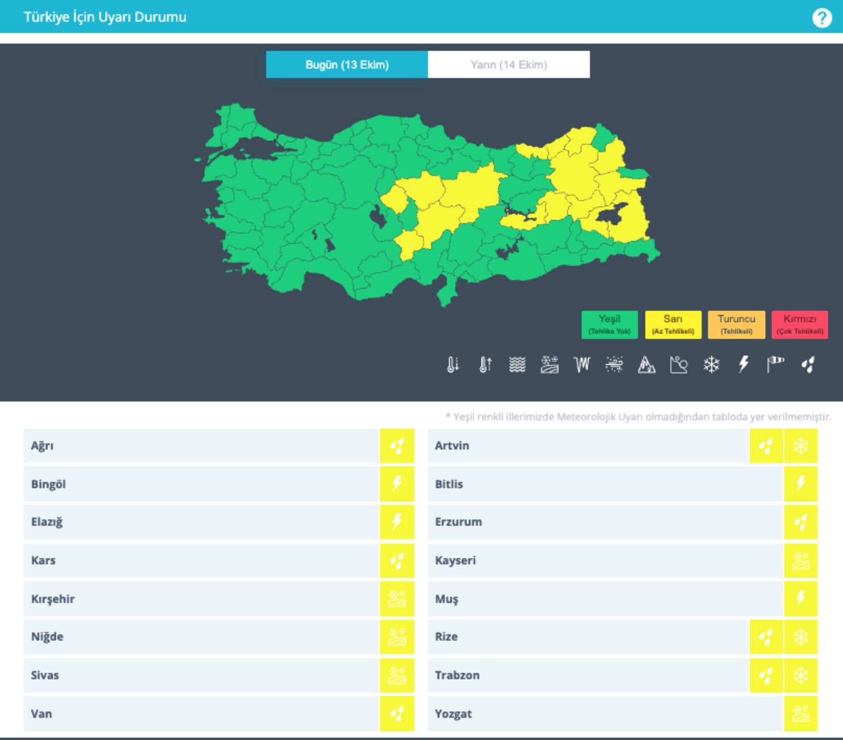 MGM'nin raporunda 16 kent için sarı alarm verildi.