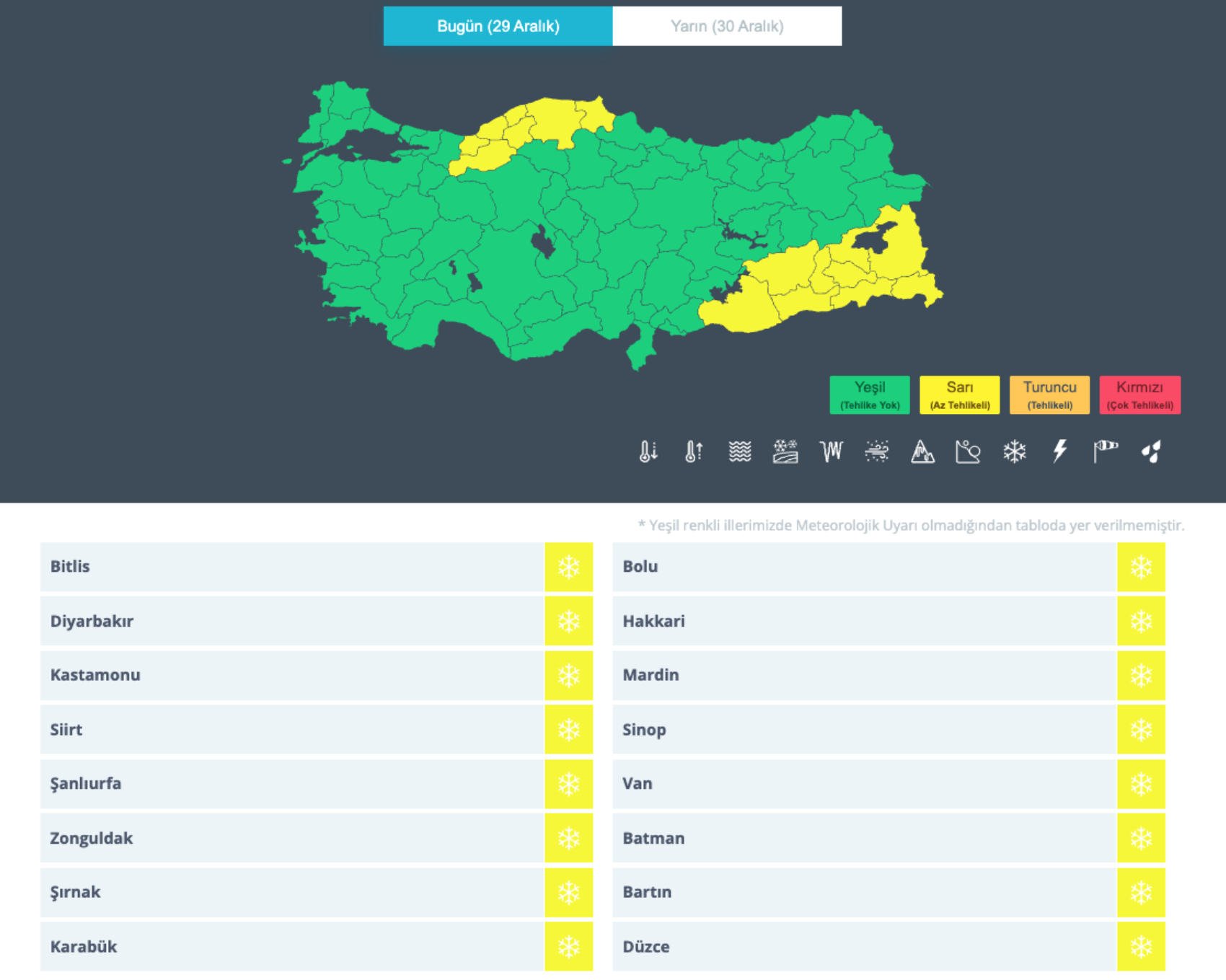 Meteoroloji Genel Müdürlüğü’nün 29 Aralık hava durumu tahmin raporunda 16 kent için sarı kodlu uyarı yapıldı. Bursa, Hatay, Ankara, Kayseri, Bolu, Düzce, Karabük, Kastamonu, Sinop, Zonguldak, Amasya, Rize, Trabzon, Erzurum, Kars, Malatya, Van, Batman, Diyarbakır, Gaziantep ve Mardin’de kar yağışı bekleniyor. Peki, bugün yurt genelinde hava nasıl olacak? İşte il il 29 Aralık Pazartesi hava durumu…