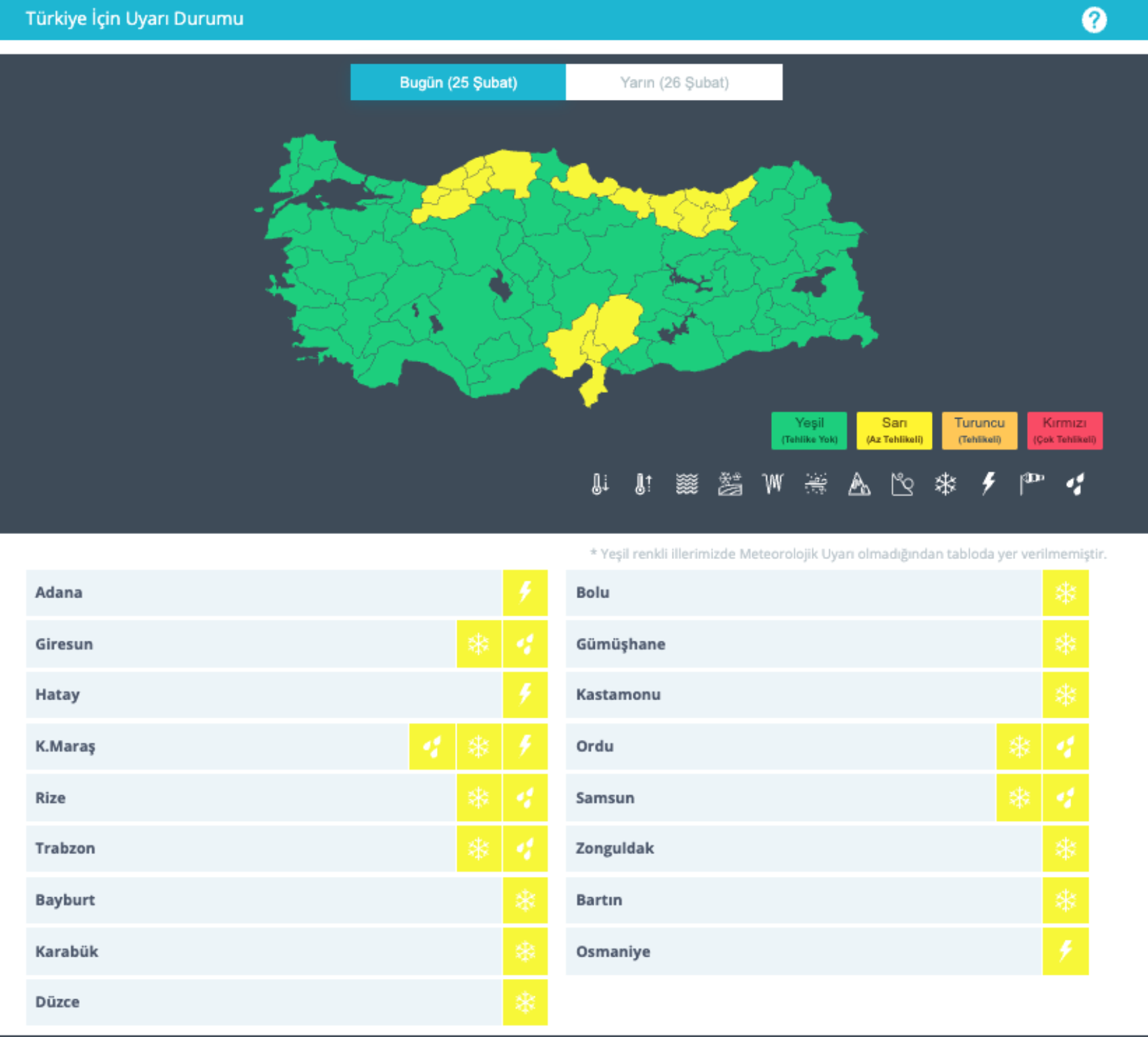 Meteoroloji Genel Müdürlüğü, yurt genelinde etkili olacak kuvvetli yağış, kar ve fırtına nedeniyle 17 kent için sarı kodlu uyarı yayımladı. Yağışların birçok bölgede kuvvetli olması beklenirken, iç ve batı kesimlerde hava sıcaklıklarının 4 ila 6 derece düşeceği bildirildi. Batı ve Orta Karadeniz’de kuvvetli rüzgâr, iç ve doğu bölgelerde ise buzlanma, don, sel ve çığ riskine karşı yurttaşların dikkatli olması istendi. Peki, bugün yurt genelinde hava nasıl olacak? İşte il il 25 Şubat Çarşamba hava durumu...