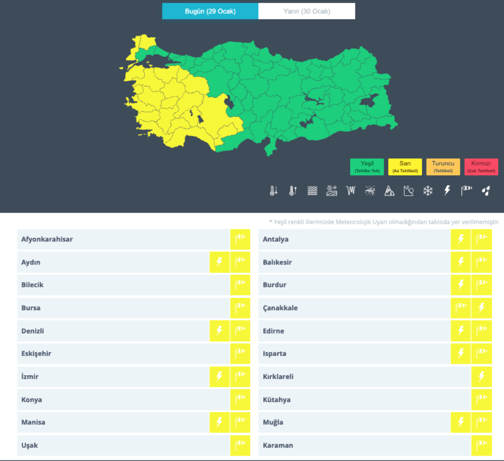 Meteoroloji Genel Müdürlüğü'nün 29 Ocak hava durumu tahmin raporunda 20 kent için sarı kodlu uyarıda bulunuldu. Edirne, İstanbul, Kocaeli, Kırklareli, Afyonkarahisar, Denizli, İzmir, Muğla, Antalya, Hatay, Isparta, Ankara, Eskişehir, Konya, Bolu, Düzce ve Van'da sağanak yağışın etkili olacağı kaydedildi. Marmara'nın güney ve batısı, Ege ve Batı Akdeniz ise fırtına bekleniyor. Peki, bugün yurt genelinde hava nasıl olacak? İşte il il 29 Ocak Perşembe hava durumu...