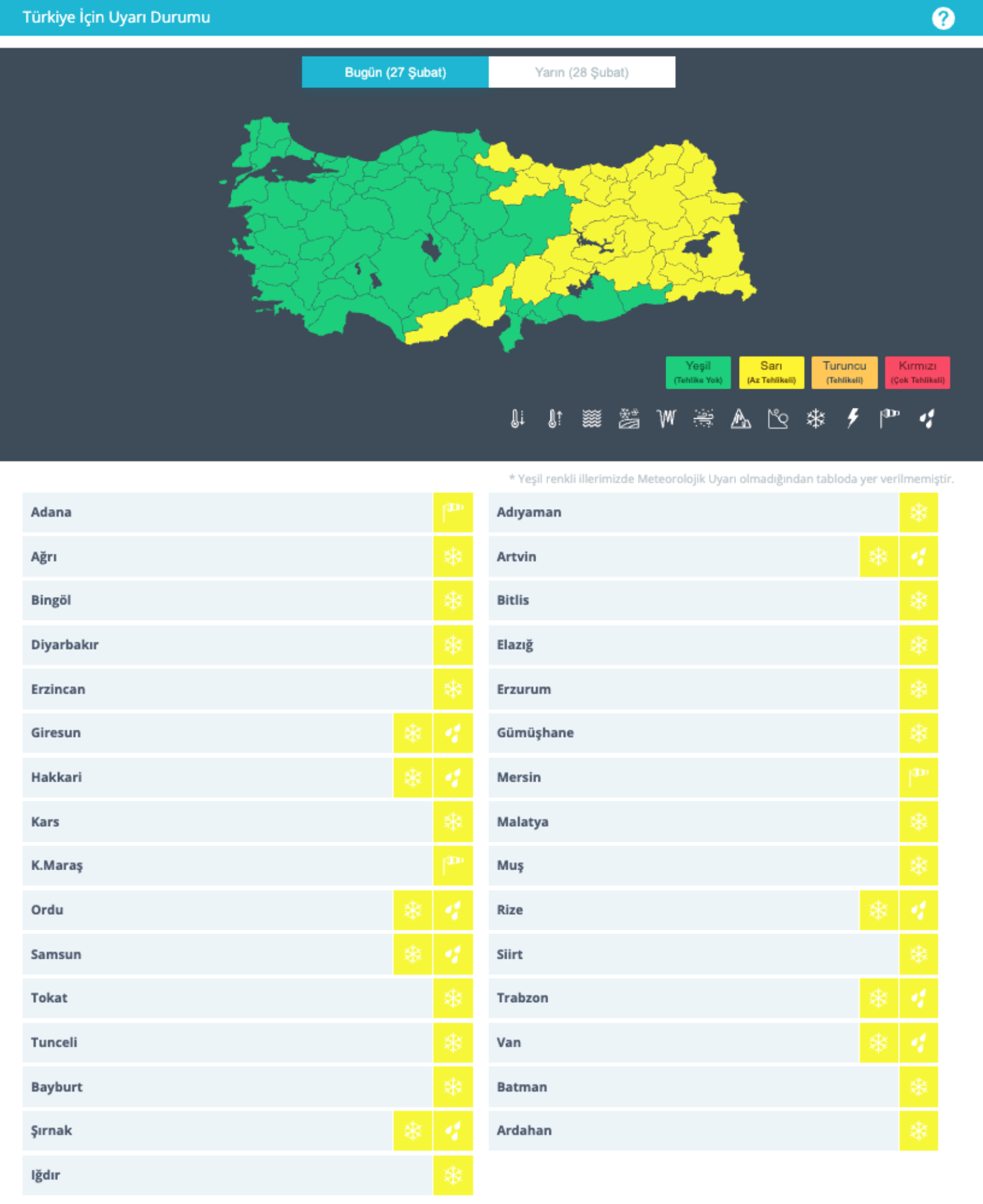 Meteoroloji Genel Müdürlüğü olarak yapılan değerlendirmelere göre: Yurdun kuzey, iç ve doğu kesimlerinin parçalı ve çok bulutlu, Marmara'nın doğusu, Karadeniz, İç ve Doğu Anadolu'nun kuzey ve doğusu ile Güneydoğu Anadolu'nun doğusunun yağışlı, diğer yerlerin az bulutlu geçeceği tahmin ediliyor. Sinop, Samsun, Ordu, Giresun ve Rize çevreleri ile Kastamonu'nun kıyı, Tokat'ın kuzey ve doğu, Trabzon'un doğu ve Artvin'in kıyı kesimlerinde kuvvetli olması beklenen yağışların genellikle karla karışık yağmur ve kar, kıyı kesimlerde yağmur şeklinde olacağı tahmin ediliyor. Sabah ve gece saatlerinde iç ve doğu bölgelerde buzlanma ve don olayı bekleniyor. Doğu Karadeniz’in iç kesimlerinin yüksekleri ile Doğu Anadolu’nun doğusunda yüksek kar örtüsüne sahip eğimli kesimlerinde çığ tehlikesi bulunmaktadır.