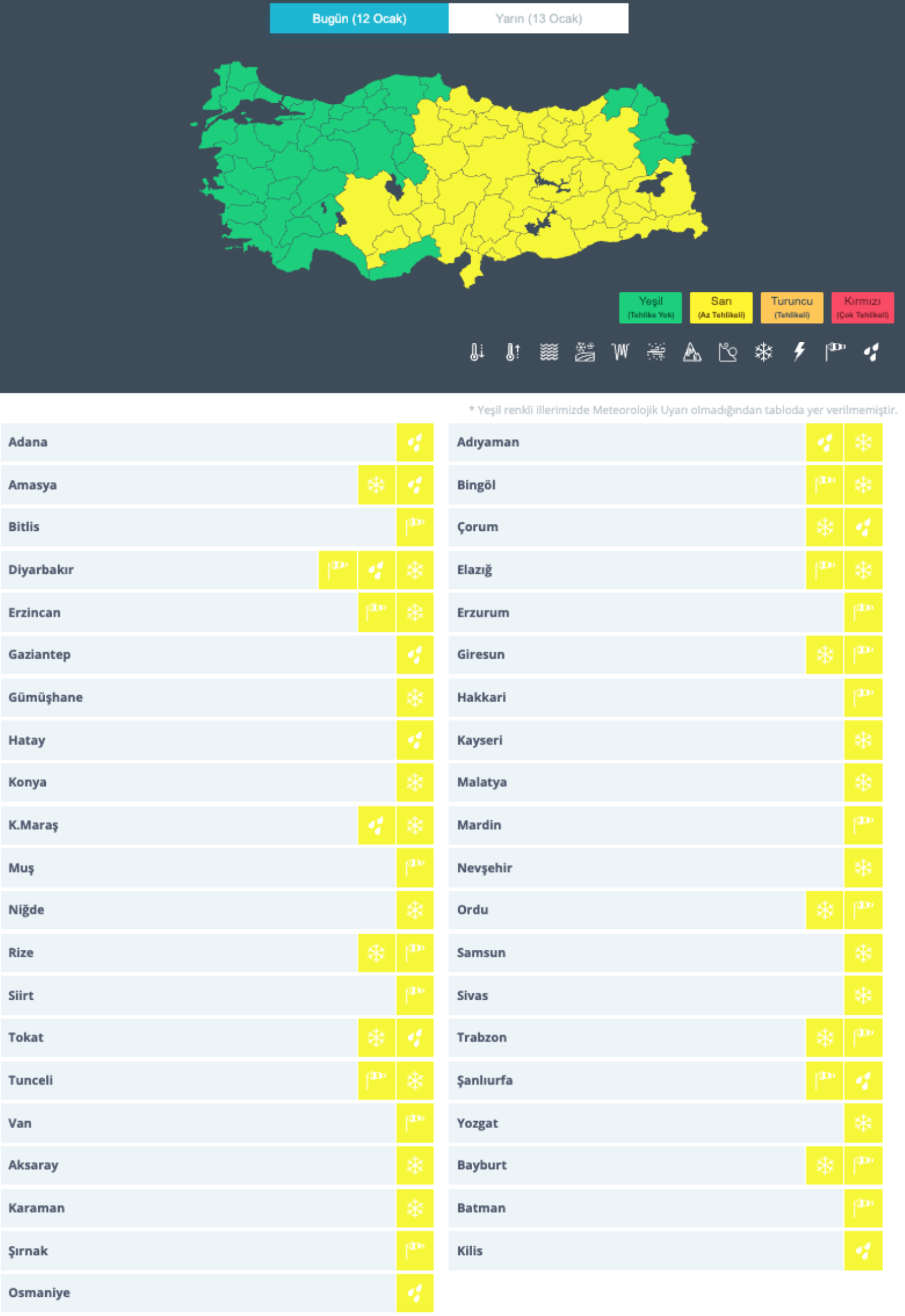 KUVVETLİ YAĞIŞ UYARISI: Yağışların, Doğu Akdeniz, Antalya'nın doğusu, Doğu ve Güneydoğu Anadolu’nun batısı ile Samsun, Ordu, Tokat, Giresun, Trabzon, Gümüşhane, Bayburt, Bingöl ve Diyarbakır çevrelerinde yerel olarak kuvvetli olması beklendiğinden yaşanabilecek olumsuz şartlara karşı (ulaşımda aksamalar, sel, su baskını, yıldırım, yerel küçük çaplı dolu, kar yağışı olan yerlerde buzlanma ve don olayı ile tipi gibi) dikkatli ve tedbirli olunması gerekmektedir.