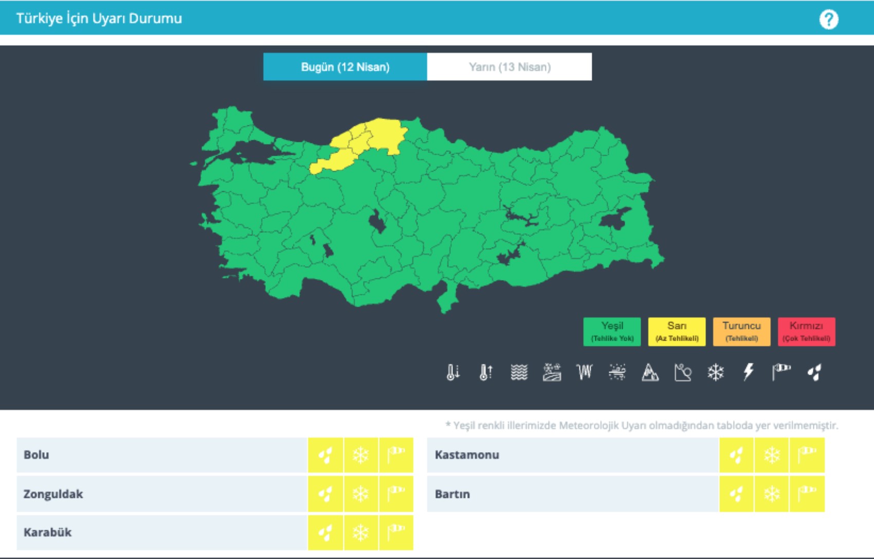 MGM'nin raporunda Bolu, Kastamonu, Zonguldak, Bartın ve Karabük için sarı kodlu uyarı yapıldı.