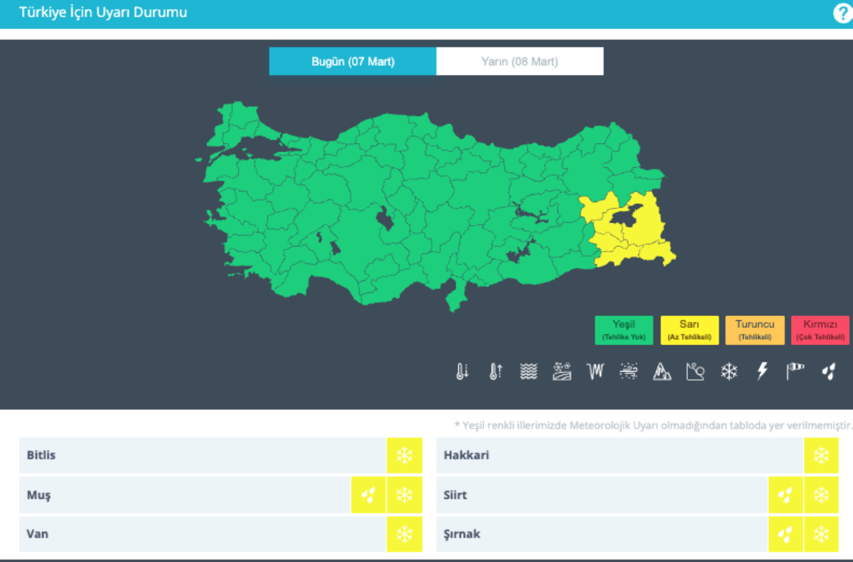 Meteoroloji Genel Müdürlüğü’nün 7 Mart Cumartesi için yaptığı değerlendirmelere göre Türkiye genelinde yağışlı hava etkisini sürdürecek. Karadeniz kıyıları ile bazı güney ve doğu illerinde yağmur beklenirken, iç ve doğu kesimlerde karla karışık yağmur ve kar görülecek. Özellikle Doğu Anadolu’nun güneydoğusu ile Mardin, Batman ve Siirt çevrelerinde yağışların yer yer kuvvetli olabileceği belirtilirken, 6 il için sarı kodlu uyarı yapıldı. Peki, bugün hava nasıl olacak? İşte il il 7 Mart Cumartesi hava durumu...