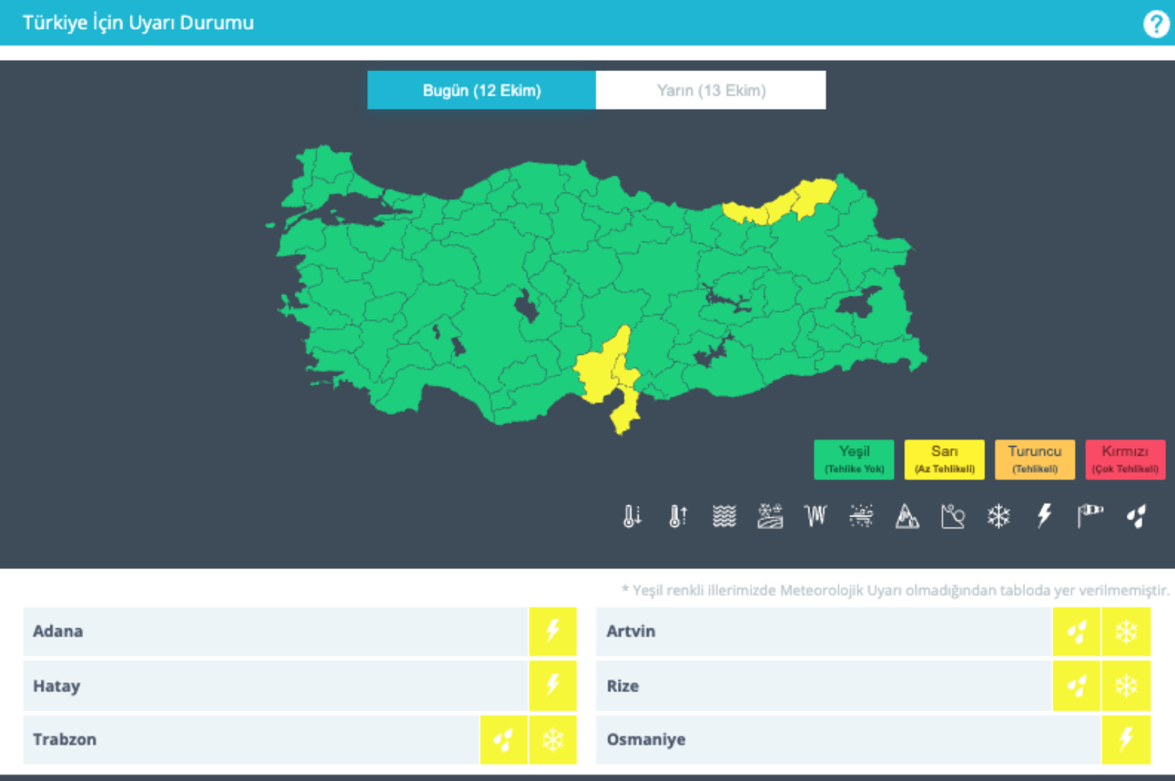 Meteoroloji Genel Müdürlüğü'nün 12 Ekim hava durumu tahmin raporunda 6 kent için sarı kodlu uyarıda bulunuldu. Hava sıcaklıklarının bazı bölgelerde 6 ila 10 derece altında seyretmesi bekleniyor. Peki, bugün yurt genelinde hava nasıl olacak? İşte il il 12 Ekim Pazar hava durumu...
