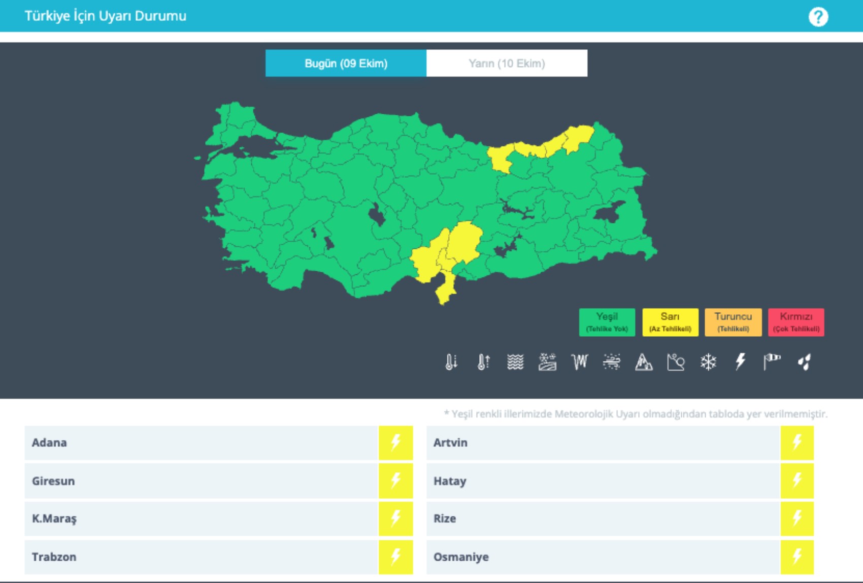 Meteoroloji Genel Müdürlüğü'nün 9 Ekim hava durumu tahmin raporunda 8 kent için sarı kodlu uyarıda bulunuldu. Öte yandan Bursa, İstanbul, Çanakkale, Kırklareli, Adana, Antalya, Hatay, Isparta, Ankara, Konya, Yozgat, Bolu, Düzce, Sinop, Zonguldak, Amasya, Rize, Samsun, Trabzon, Erzurum, Kars, Malatya, Van ve Gaziantep'te gök gürültülü sağanak yağış beklendiği kaydedildi. Hava sıcaklıklarının doğu kesimlerde 4 ila 6 derece azalması bekleniyor. Peki, bugün yurt genelinde hava nasıl olacak? İşte il il 9 Ekim Perşembe hava durumu...