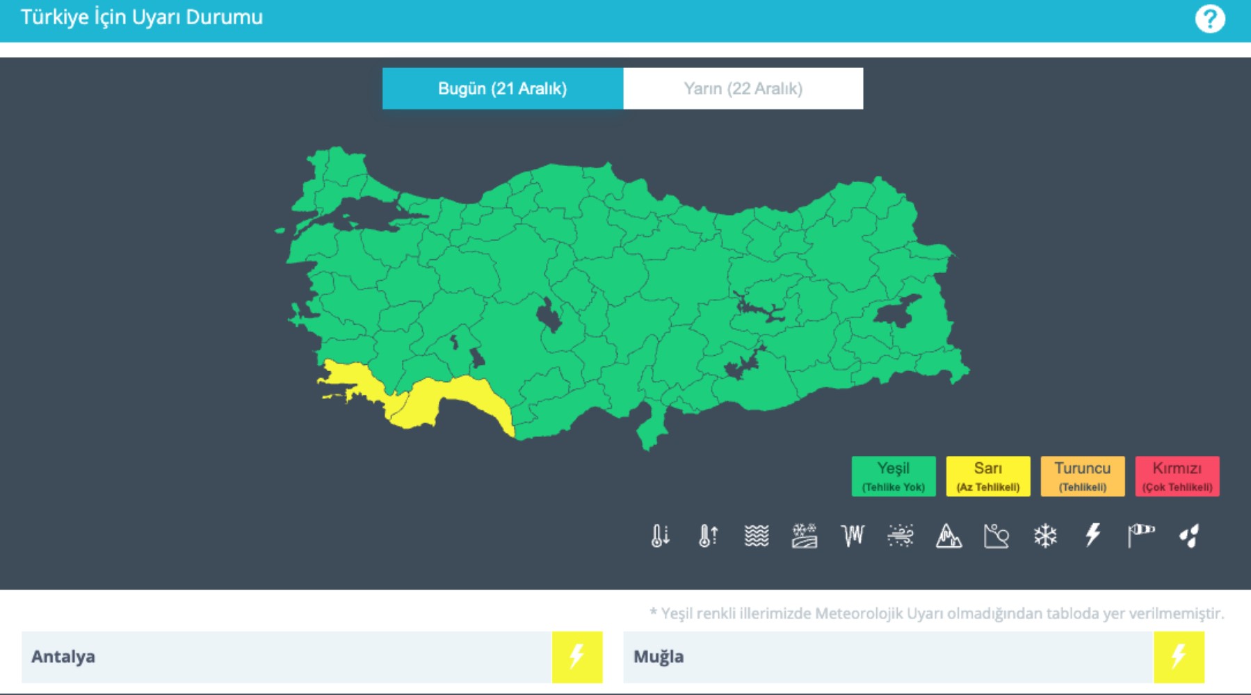 MGM'nin raporunda Muğla ve Antalya için sarı kodlu uyarıda bulunuldu.