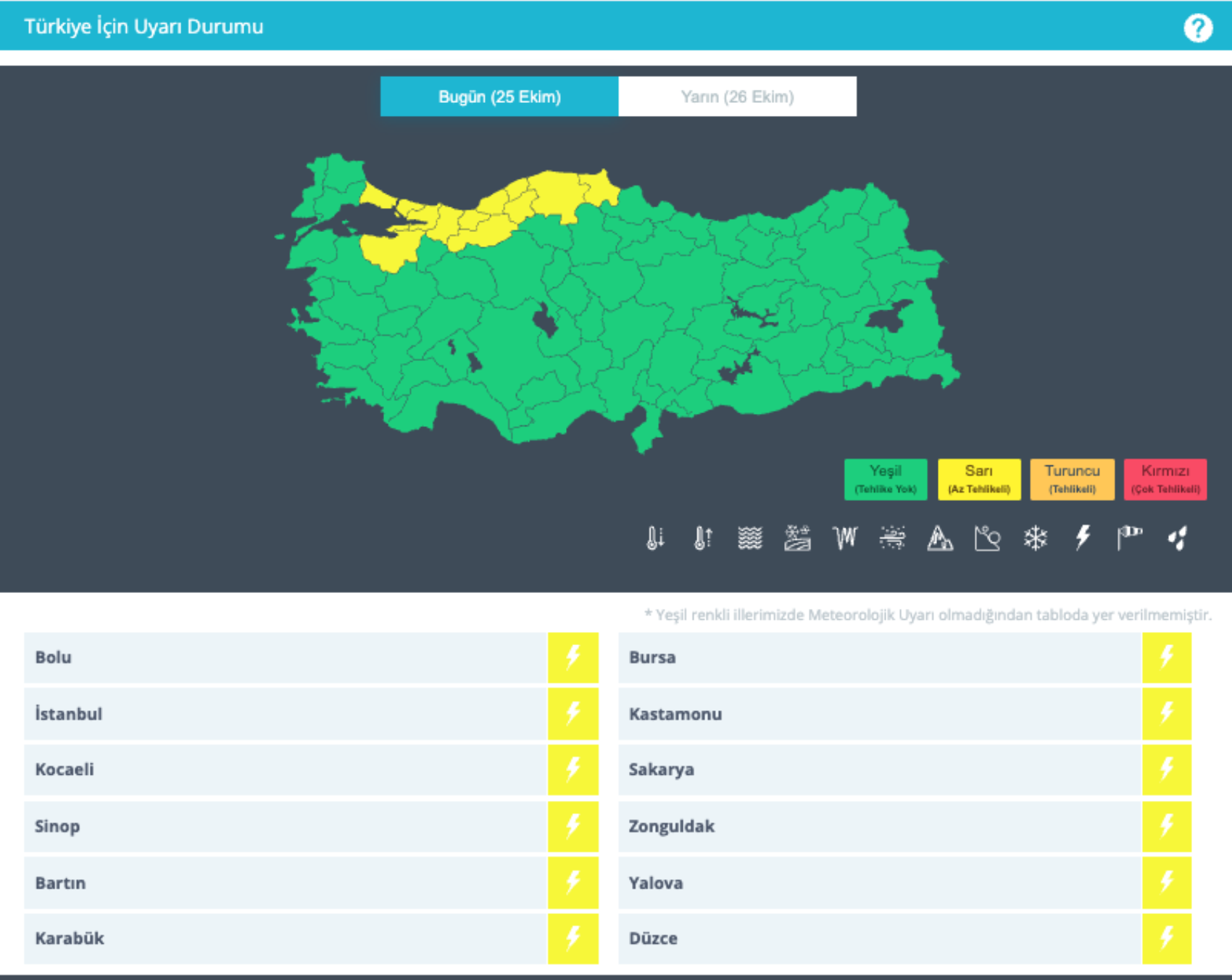 MGM'nin raporunda İstanbul, Kocaeli, Sakarya, Bursa, Düzce, Yalova, Bolu, Kastamonu, Zonguldak, Bartın, Sinop ve Karabük için sarı kodlu uyarıda bulunuldu. Kuvvetli yağış ve rüzgar nedeniyle sel, su baskını ve yıldırım gibi olumsuzluklara karşı tedbirli olunması gerektiği vurgulandı.