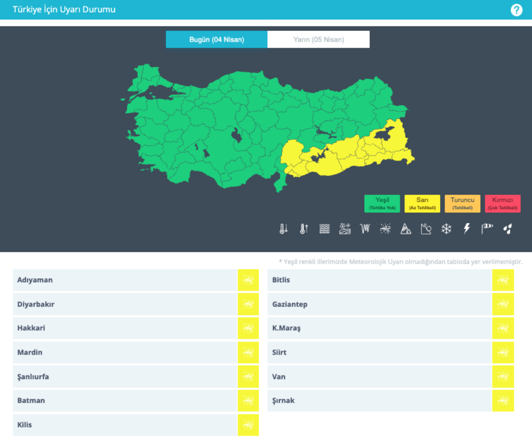 Meteoroloji Genel Müdürlüğü (MGM) tarafından yapılan son değerlendirmelere göre: Ülkemiz genelinin çok bulutlu, Bartın ve Kastamonu kıyıları ile Gaziantep, Kilis, Adıyaman, Ş.Urfa ve Mardin dışında kalan yerlerin aralıklı yağışlı geçeceği tahmin ediliyor. Yağışların; genellikle yağmur ve sağanak, yer yer gök gürültülü sağanak, Doğu Anadolu’nun doğusunun yükseklerinde karla karışık yağmur ve yer yer kar şeklinde olması bekleniyor. Yağışların; Ege kıyılarında yer yer kuvvetli olması bekleniyor. Doğu Karadeniz'in iç kesimleri ile Doğu Anadolu'da yüksek kar örtüsüne sahip eğimli alanlarda çığ ve kar erimesi tehlikesi bulunmaktadır. Doğu Akdeniz ile Güneydoğu Anadolu’da toz taşınımı bekleniyor.