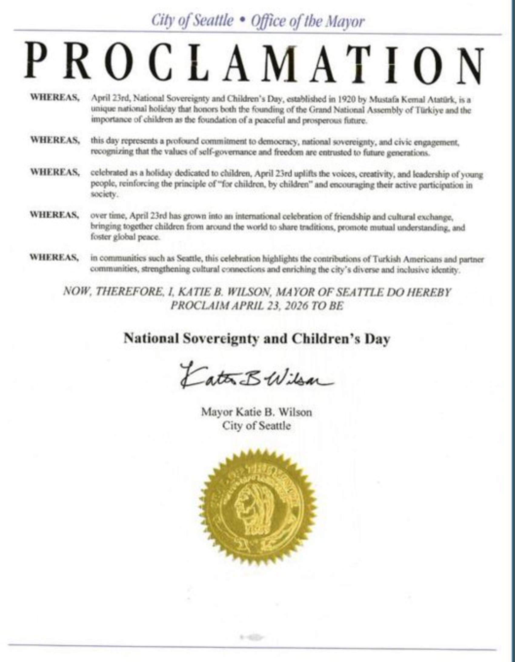 Çevirmen İlknur Özdemir'in sosyal medya hesabından yaptığı duyuruya göre, ABD’nin büyük şehirlerinden Seattle’ın Belediye Başkanı Katie B. Wilson, 23 Nisan’ın önemini ve değerini anlattıktan sonra bu günü kendisinin de şehrinde Ulusal Egemenlik ve Çocuk Bayramı olarak ilan ettiğini bir bildiriyle duyurdu.