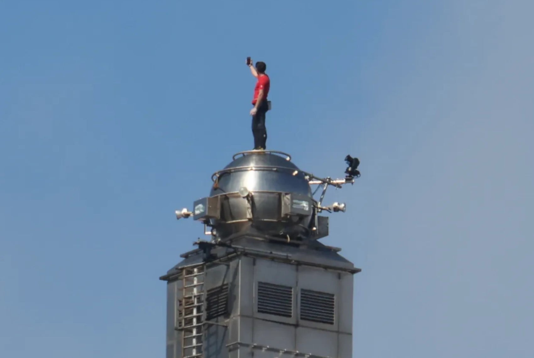 Tırmanışının son aşaması, 121 metrelik külah kısmına kadar devam etti. Burada, tutunmanın oldukça zor olduğu yerlerden çıkarak, binanın direğinin ucuna ulaşan Honnold, başarısını taçlandırmak için tepede özçekim yaptı.