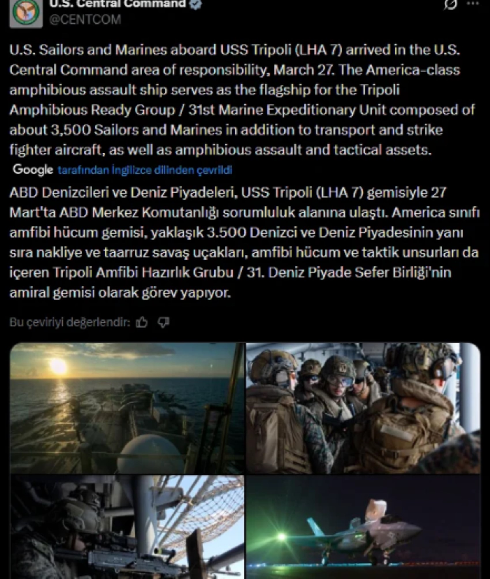 ABD Merkez Komutanlığı (CENTCOM), sosyal medya hesabından yaptığı açıklama ile yaklaşık 3 bin 500 denizci ve deniz piyadesini taşıyan USS Tripoli amfibi hücum gemisinin Orta Doğu’daki görev bölgesine ulaştığını duyurdu.