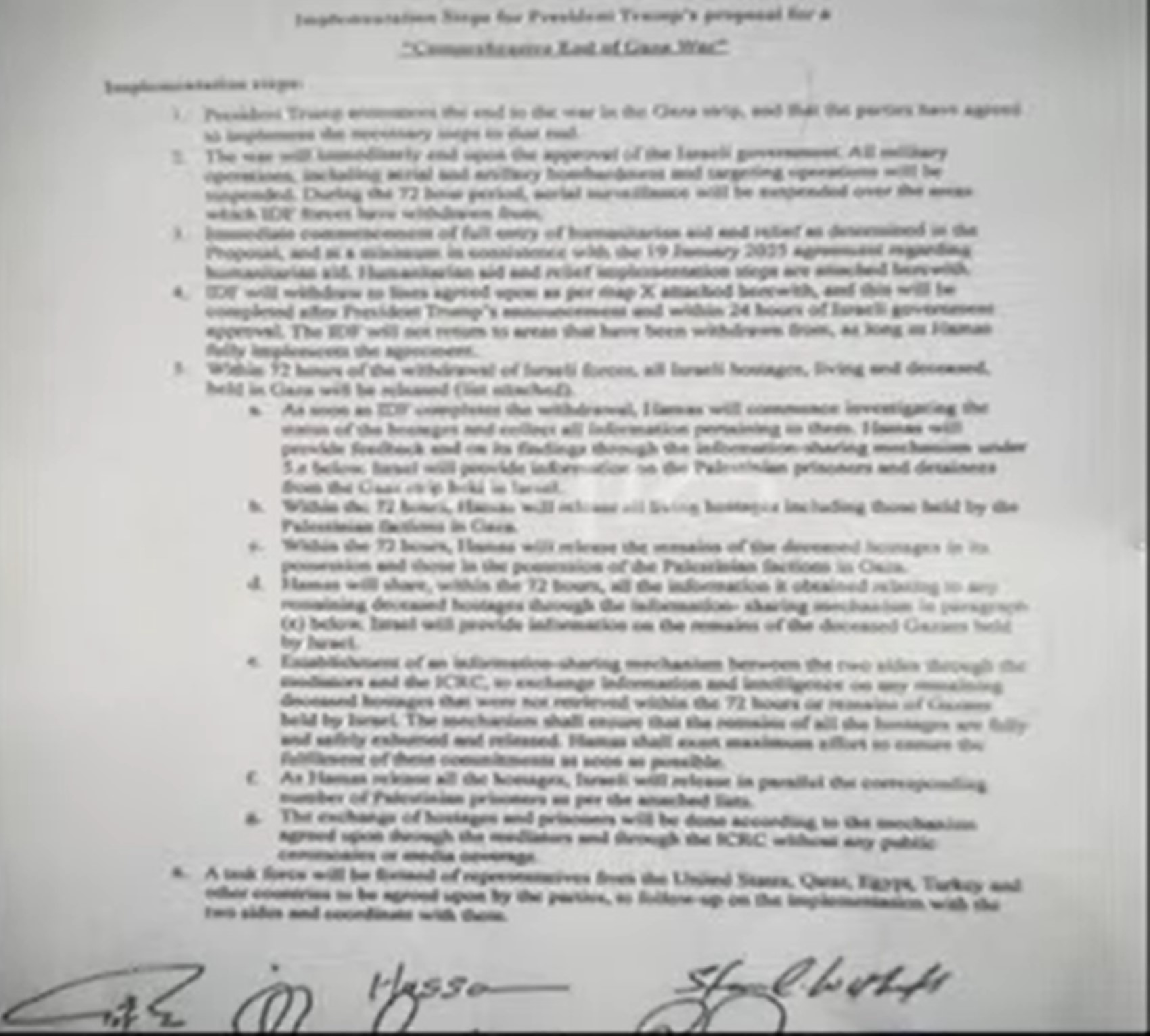 İsrail devlet televizyonu KAN'ın paylaştığı taslak metne göre, ateşkesin açıklanmasından sonraki 24 saatte İsrail ordusunun güncellenen haritadaki hatlara çekileceği belirtildi. İsrail ordusunun çekilmesi tamamlandıktan sonraki 72 saatlik sürede Hamas'ın Gazze Şeridi'ndeki İsrailli esirlerin tamamını teslim edeceği, İsrail'in de buna karşılık 250 ağır hapis cezasına çarptırılmış Filistinli esir ile 7 Ekim 2023'ten sonra Gazze Şeridi'nden alıkonulan 1700 kişi ve 22 çocuğu serbest bırakacağı, ayrıca İsrail tarafından öldürülen 360 Filistinlinin cenazesinin teslim edileceği belirtildi.