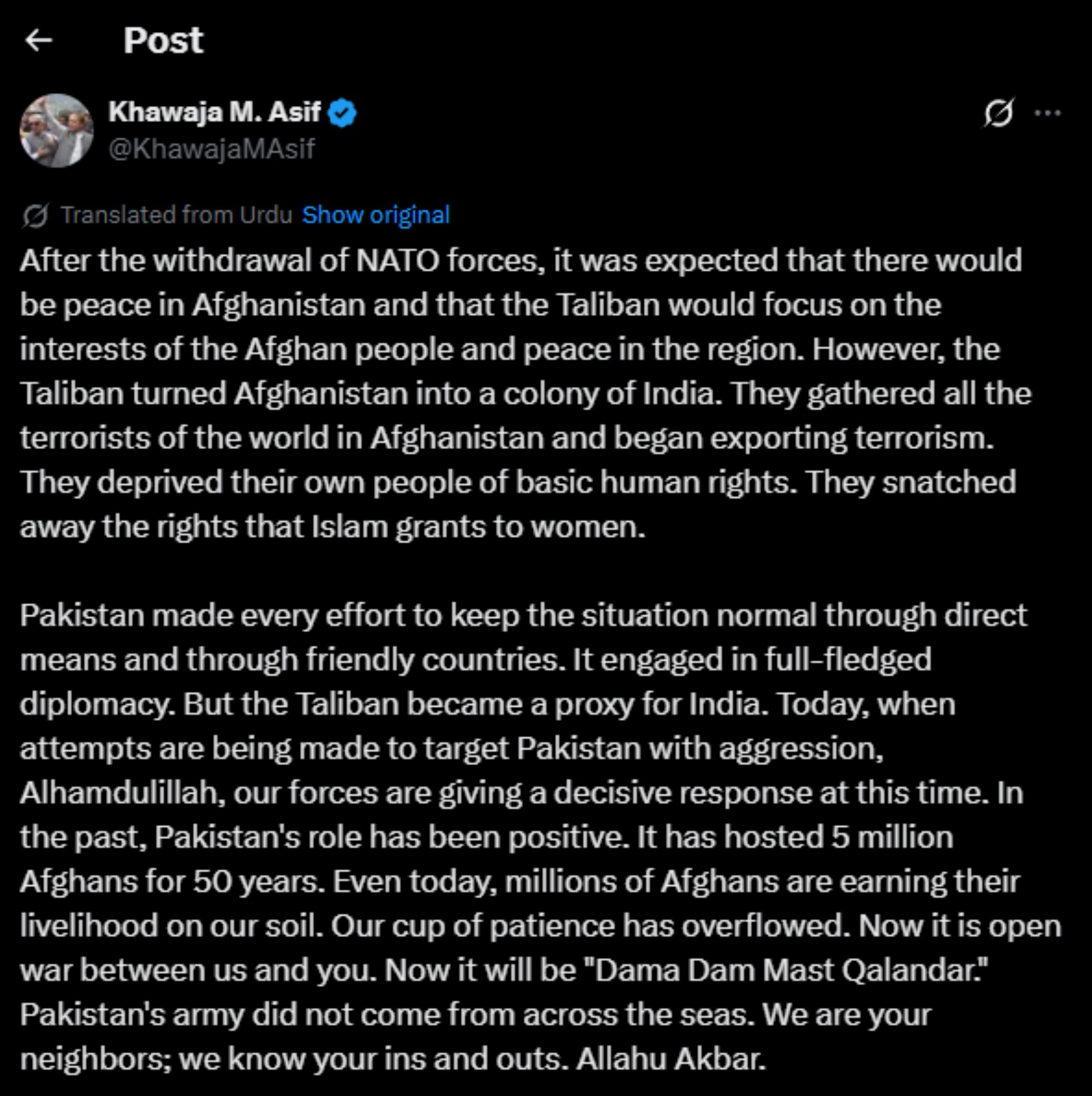 Pakistan’ın geçmişteki yaklaşımı yapıcıydı. Yarım asır boyunca yaklaşık 5 milyon Afgan’a ev sahipliği yaptık. Hâlen de milyonlarca Afgan topraklarımızda yaşamını sürdürüyor. Ancak artık tahammül sınırına gelindi. Bundan sonra sizinle açık bir savaşa girilecektir. Ateş artık yakılmıştır. Pakistan ordusu uzaklardan gelmedi; biz sizin komşunuzuz. Zamanınızı da şartlarınızı da biliyoruz. Allahu Ekber.”