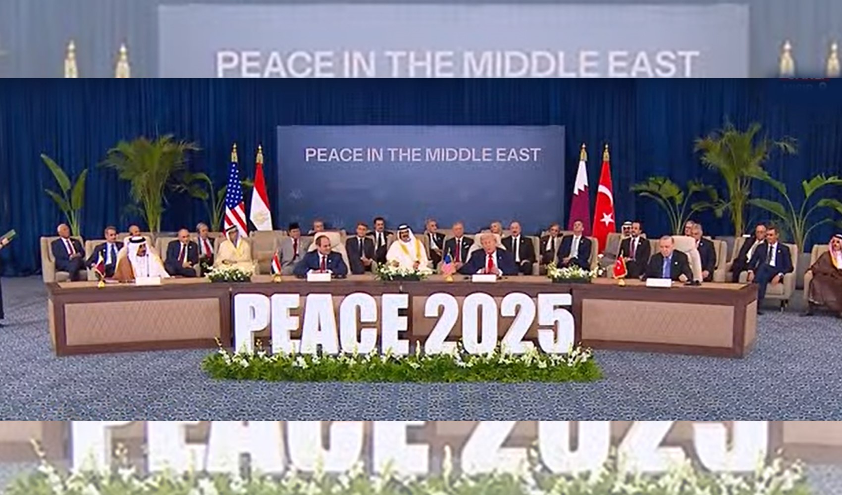 Mısır'daki Gazze zirvesinin başlamasına kısa süre kalırken, ABD Başkanı Trump ile Cumhurbaşkanı Erdoğan, aile fotoğrafında yan yana geldi. Trump ve Erdoğan tokalaşırken kısa bir süre ayaküstü sohbet etti. Zirveye katılan ülkelerin liderleri toplu fotoğraf çektirdi. Trump atılan imzaların ardından açıklamalarda bulundu.