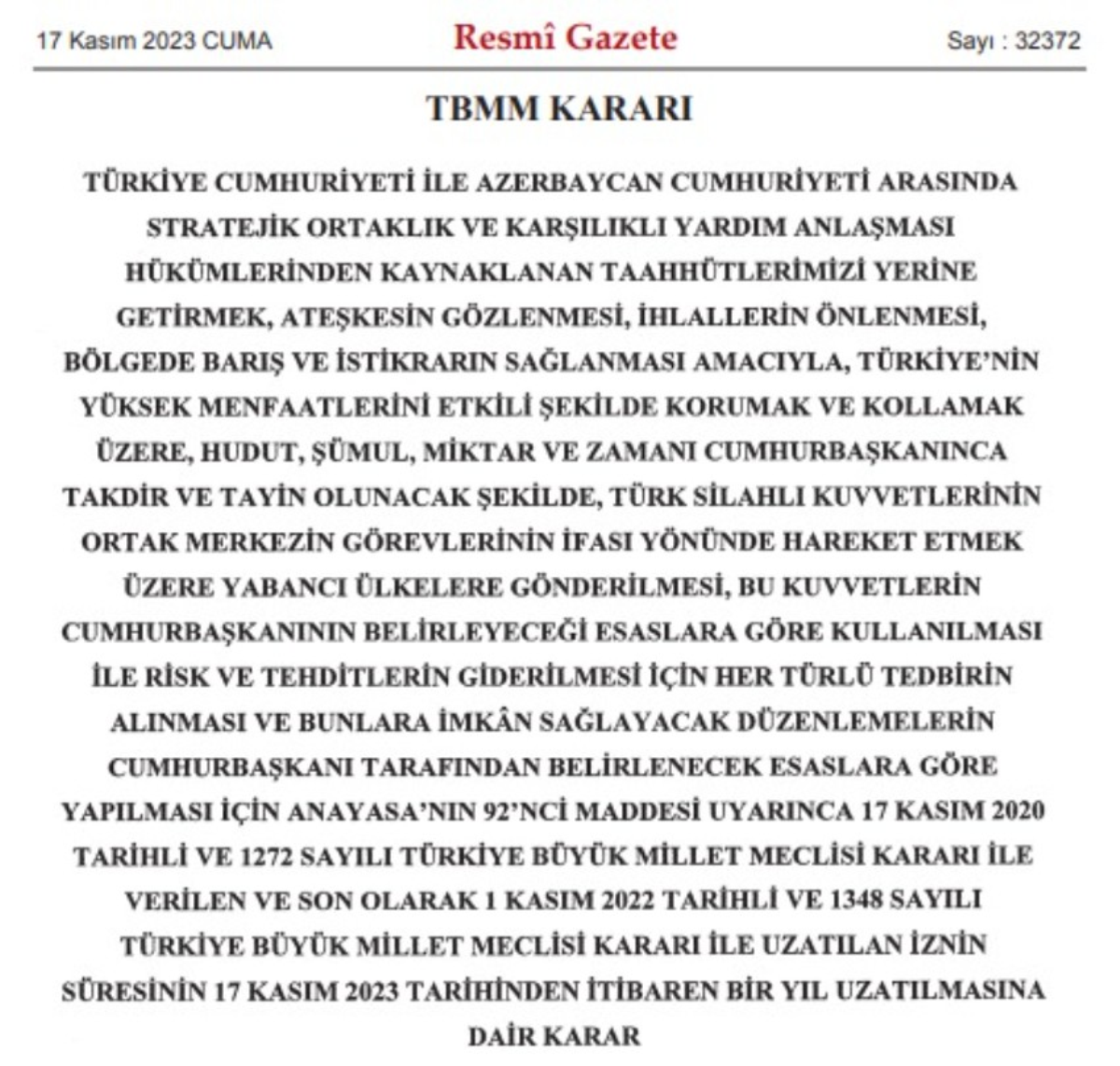 Türk Silahlı Kuvvetleri (TSK)'nın, Azerbaycan'daki görev süresini 1 yıl uzatan Cumhurbaşkanlığı tezkeresi TBMM’de kabul edilmişti. Kararı ise bugünkü Resmi Gazete’de yayımlandı.