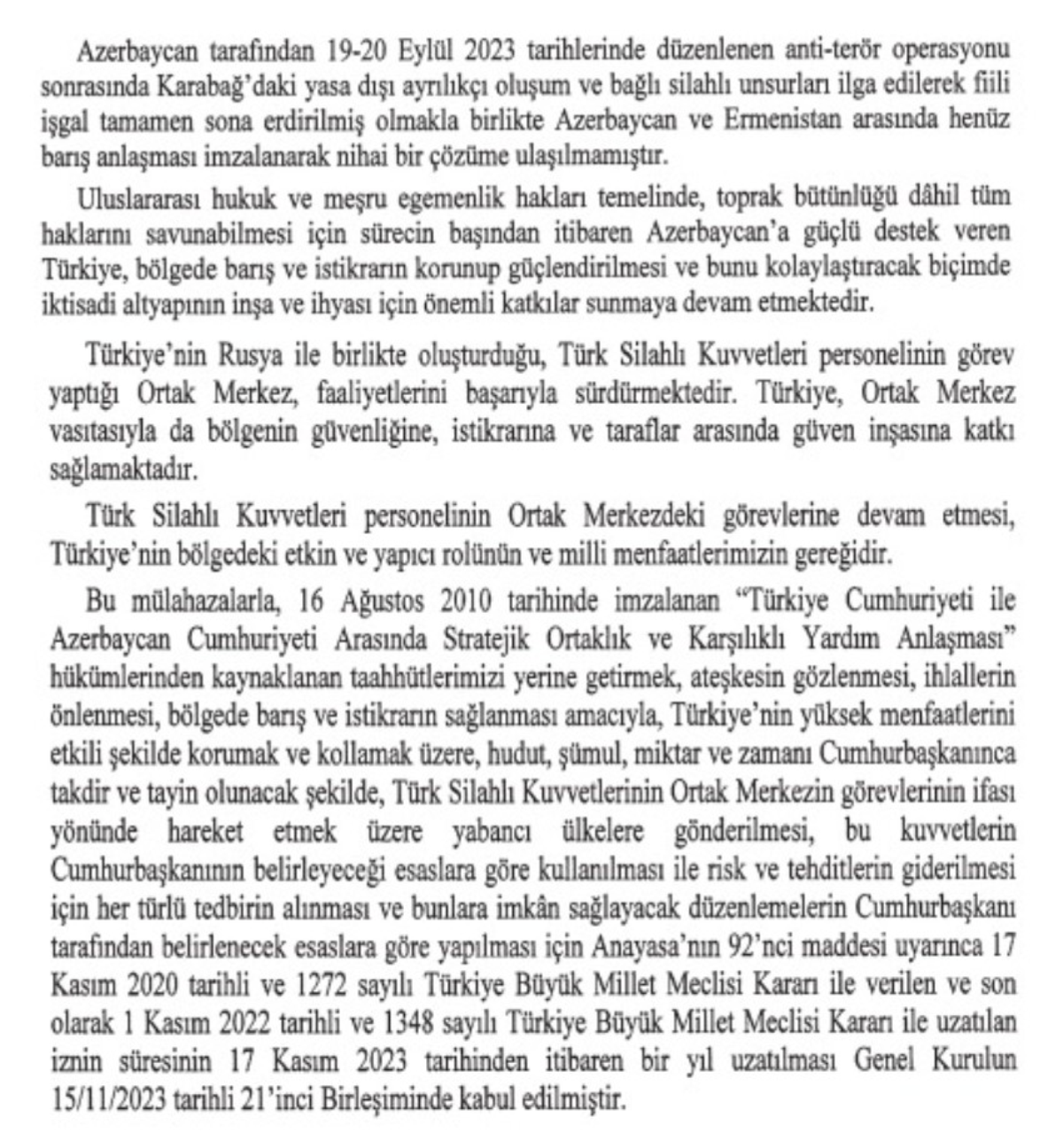 "Türkiye Cumhuriyeti ile Azerbaycan Cumhuriyeti arasında stratejik ortaklık ve karşılıklı yardım anlaşması hükümlerinden kaynaklanan taahhütleri yerine getirmek, ateşkesin gözlenmesi, ihlallerin önlenmesi, bölgede barış ve istikrarın sağlanması amacıyla, Türkiye’nin yüksek menfaatlerini etkili şekilde korumak ve kollamak üzere, hudut, şümul, miktar ve zamanı cumhurbaşkanınca takdir ve tayin olunacak şekilde, Türk silahlı kuvvetlerinin ortak merkezin görevlerinin ifası yönünde hareket etmek üzere yabancı ülkelere gönderilmesi, bu kuvvetlerin cumhurbaşkanının belirleyeceği esaslara göre kullanılması ile risk ve tehditlerin giderilmesi için her türlü tedbirin alınması ve bunlara imkân sağlayacak düzenlemelerin cumhurbaşkanı tarafından belirlenecek.