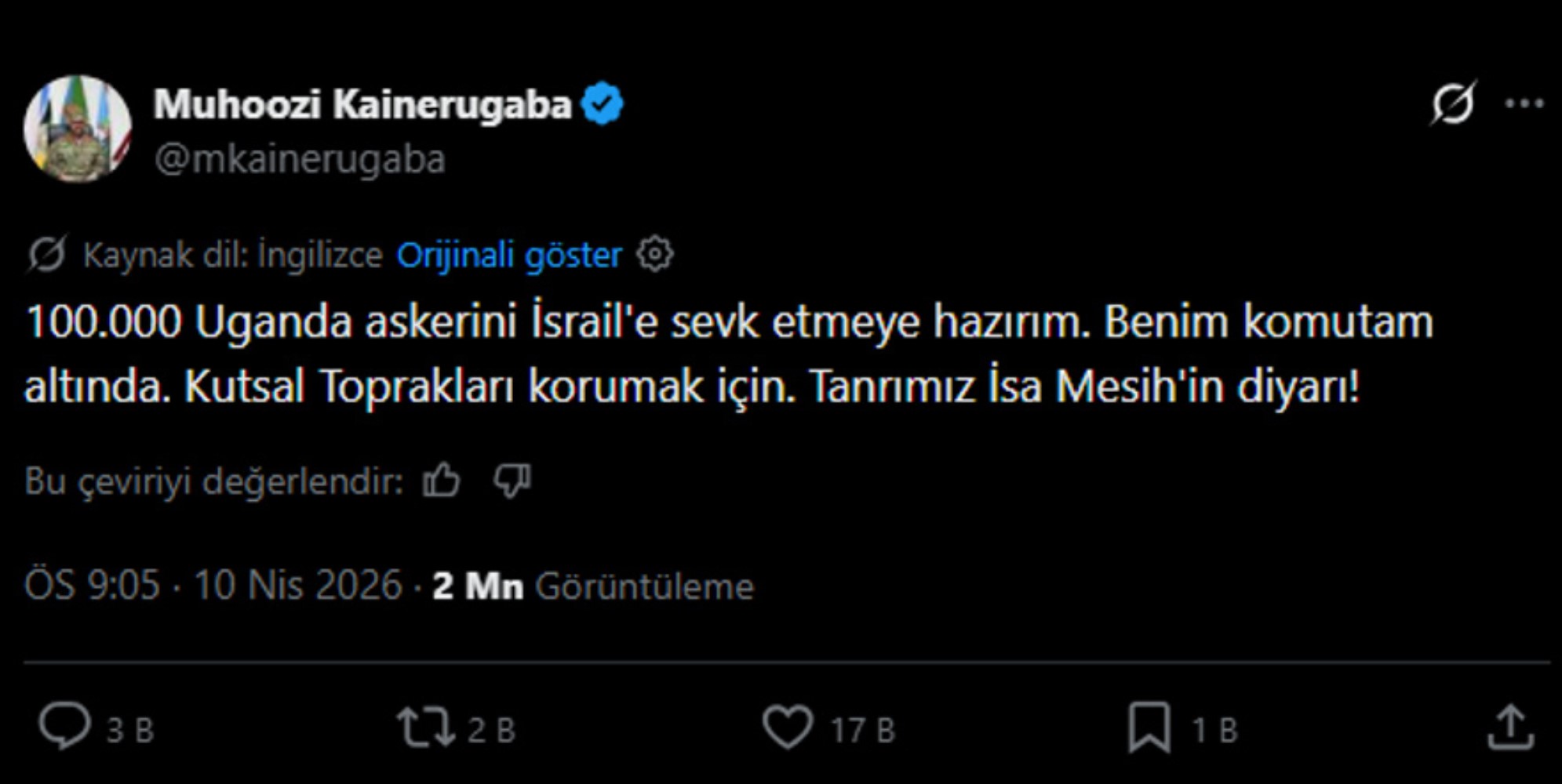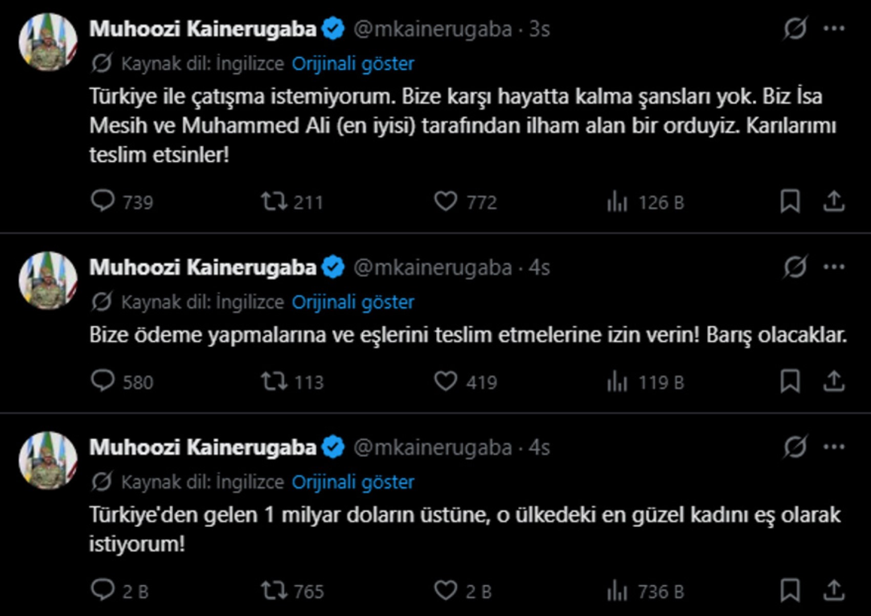 Türkiye’ye yönelik küstah talepler ve tehdit içeren paylaşımlar yapan Uganda Savunma Kuvvetleri Komutanı Muhoozi Kainerugaba, kısa süre sonra geri adım atarak mesajlarının büyük bölümünü sildi.