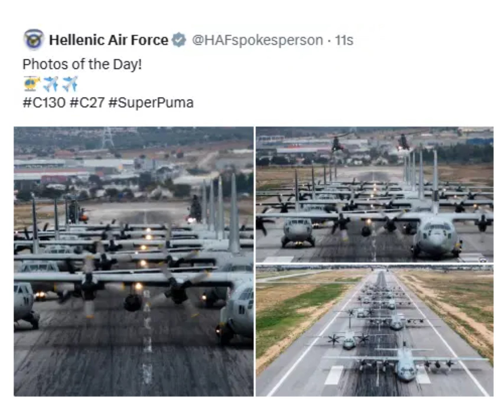 Yunanistan Hava Kuvvetleri, resmi sosyal medya hesabı üzerinden yaptığı C130 kargo uçaklarının bulunduğu "Günün fotoğrafı" başlıklı küstah paylaşımını kaldırdı. Hesaptan, daha sonra "Yunanistan Hava Kuvvetleri Komutanı'ndan Türk mevkidaşına taziye mektubu" başlığıyla Gürcistan'daki askeri kargo uçağı kazası için taziye mesajı yayınladı.