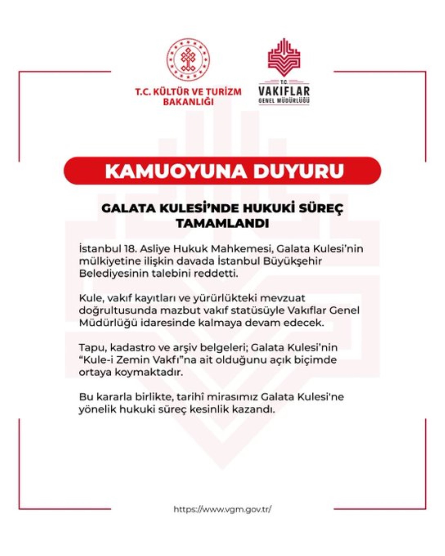 Vakıflar Genel Müdürlüğü, davadaki gelişmeyi sosyal medya hesabından duyurdu. Yapılan açıklamada, "Galata Kulesi, vakıf kayıtları ve yürürlükteki mevzuat doğrultusunda mazbut vakıf statüsüne sahip olup, Vakıflar Genel Müdürlüğü idaresinde kalmaya devam edecektir," denildi.