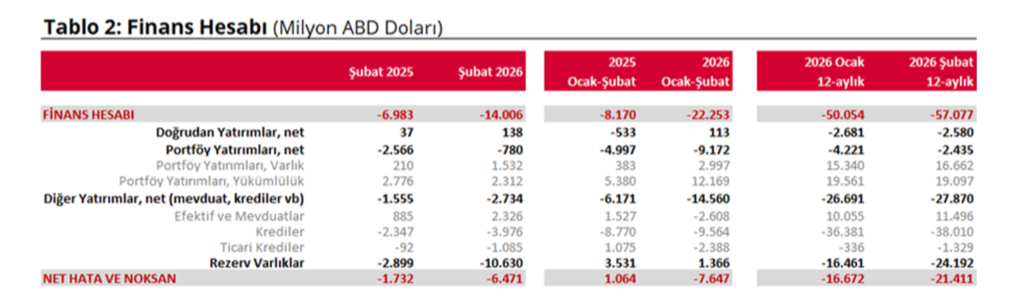 TCMB’nin Şubat 2026 ödemeler dengesi verileri, Ortadoğu’daki gerilim öncesinde piyasalarda artan tedirginliğin finansal tablolara yansıdığını ortaya koydu. Cari açık 7,5 milyar dolar olurken, kaynağı belirsiz işlemleri gösteren net hata ve noksan kaleminde 6,4 milyar dolarlık çıkış dikkat çekti.