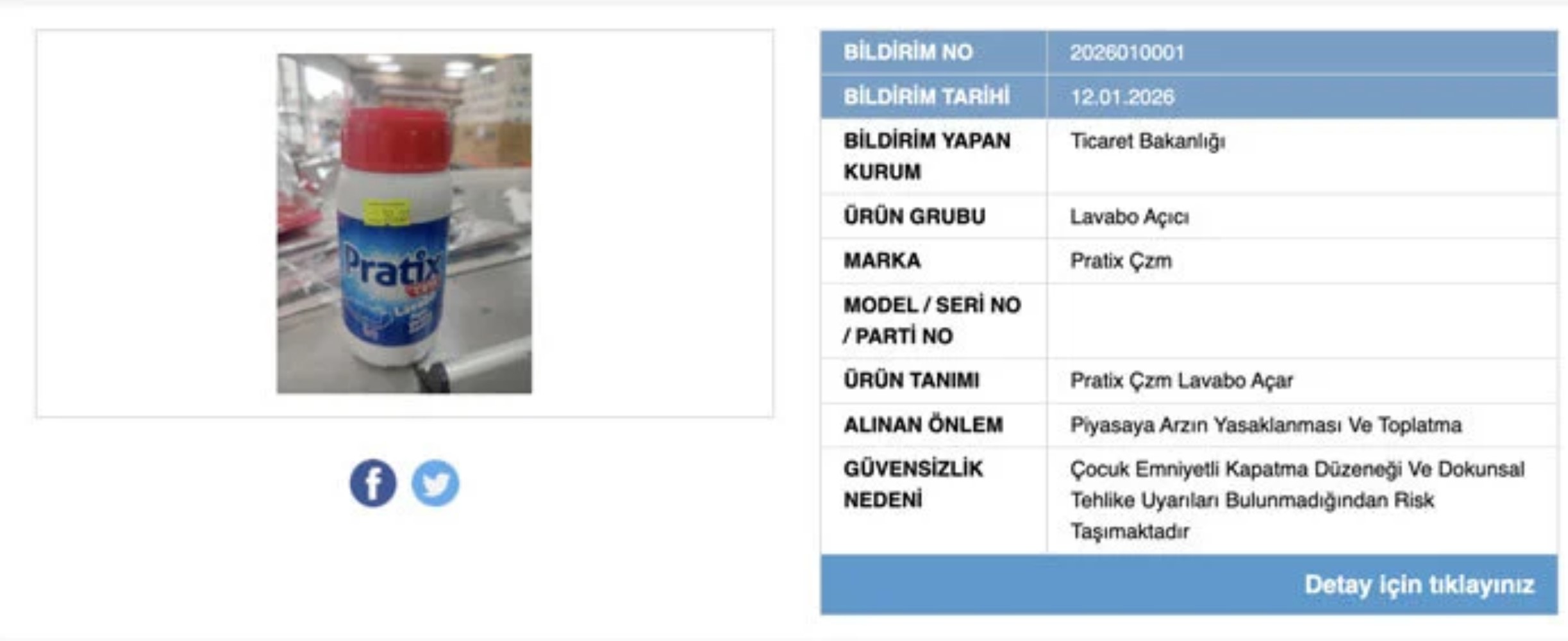 GÜBİS’te yer alan bilgilere göre, Pratix Çzm markalı lavabo açıcı için satış yasağı getirildi ve ürünün piyasadan çekilmesi kararlaştırıldı. Kararın gerekçesi olarak, ürünün ambalaj ve güvenlik kriterlerini karşılamadığı ifade edildi.
