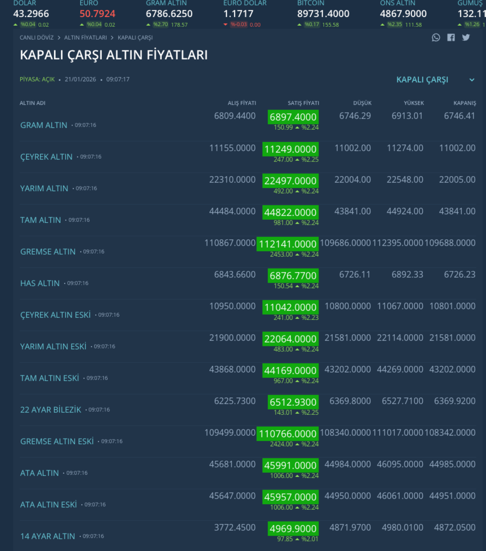 Ons altındaki sert yükseliş, iç piyasada gram altına da yansıdı. Kapalıçarşı’da altının gram fiyatı 6.896 TL seviyesine kadar çıktı.