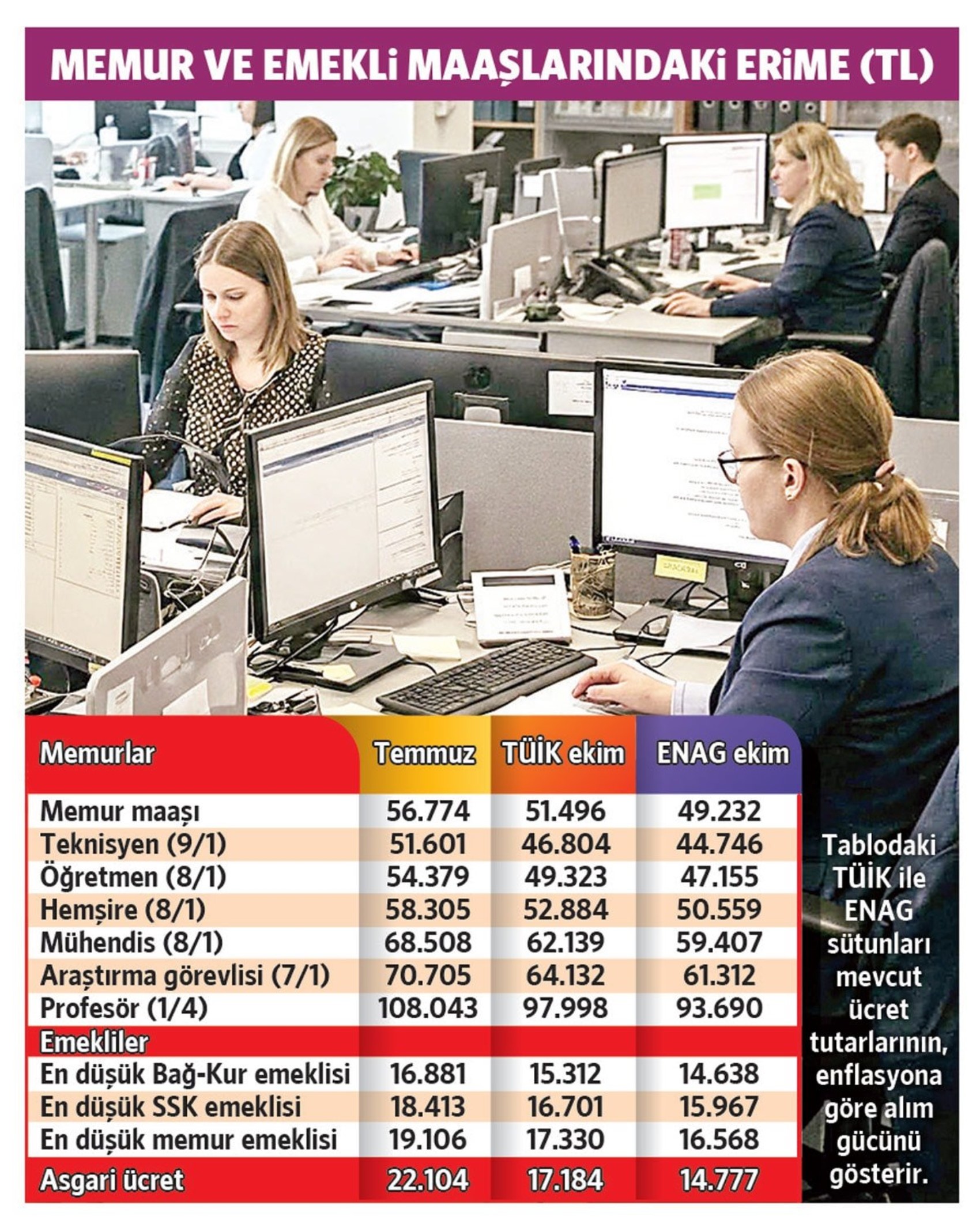 Bu durum, yılın başında 22 bin 104 lira olan asgari ücretin, TÜİK verilerine göre kasım ayı itibarıyla reel alım gücünün 17 bin 184 liraya düştüğünü gösteriyor. ENAG'ın hesaplamalarına göre ise asgari ücretin reel alım gücü 14 bin 777 liraya kadar geriledi.