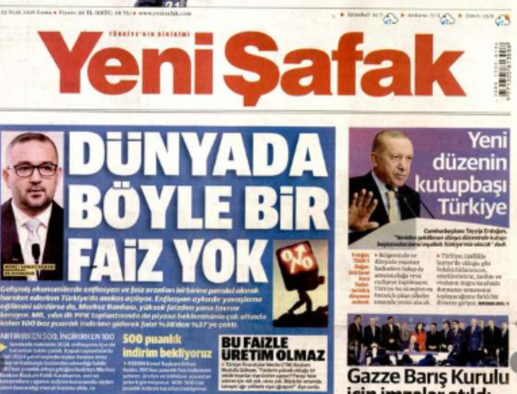 İktidar medyasından Yeni Şafak, Merkez Bankası'nın dünkü faiz indirimi kararını "Dünyada böyle bir faiz yok" başlığıyla eleştirdi. Gazete, faiz oranlarının gelişmiş ekonomilerde enflasyonla paralel hareket ederken, Türkiye’de bu farkın açıldığına vurgu yaptı.