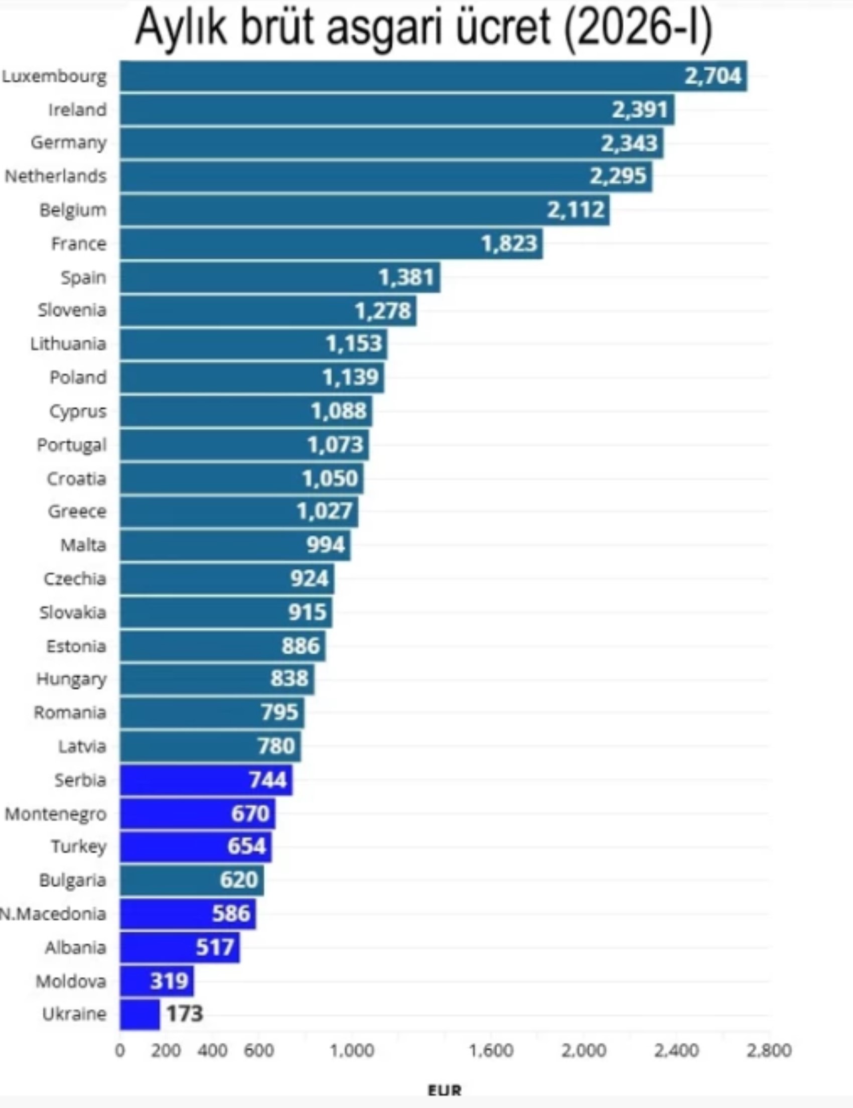 Avrupa Birliği’nde asgari ücretlerin 2.000 Euro’nun üzerinde olduğu beş ülke bulunuyor. Bu ülkeler Lüksemburg (2.704 Euro), İrlanda (2.391 Euro), Almanya (2.343 Euro), Hollanda (2.295 Euro) ve Belçika (2.112 Euro). Fransa ise 1.823 Euro ile bu sıralamada yer alırken, İspanya'da bu rakam 1.381 Euro'ya kadar düşüyor. Bunun yanında, Doğu Avrupa ülkeleri asgari ücrette Batı Avrupa ülkelerinin gerisinde kalıyor. En düşük asgari ücrete sahip ülkeler arasında Ukrayna (173 Euro) ve Moldova (319 Euro) yer alırken, Avrupa Birliği dışındaki diğer ülkelerde asgari ücretler oldukça düşük seviyelerde.