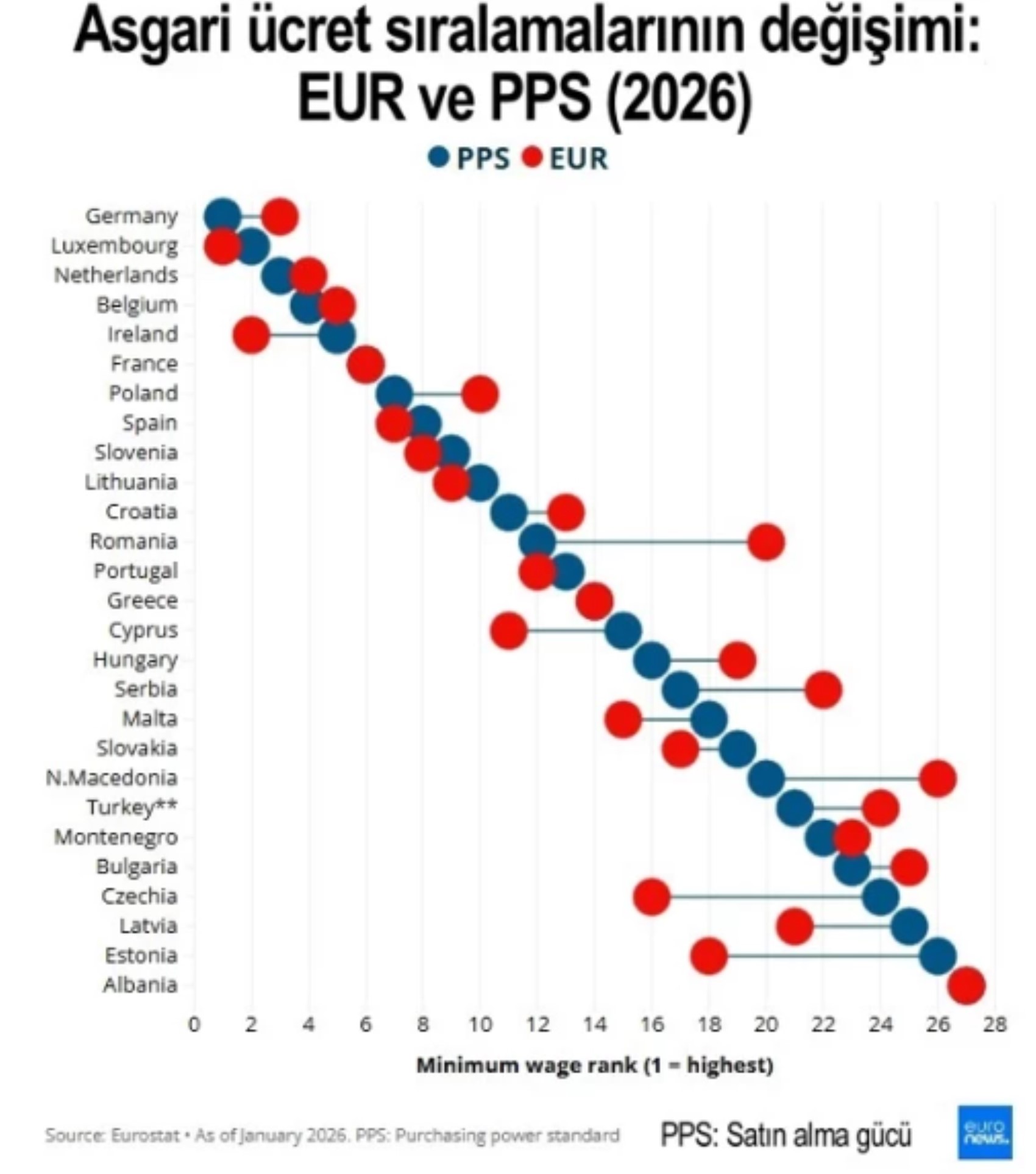 2026 yılı itibarıyla Türkiye’de brüt asgari ücret 654 Euro seviyesinde bulunuyor. Bu rakam, Avrupa ülkeleriyle karşılaştırıldığında Türkiye'yi düşük sıralarda bırakıyor. Türkiye, Bulgaristan’ı geçerken, Romanya, Macaristan, Çekya gibi Doğu Avrupa ülkelerinin gerisinde kalıyor. Ancak, satın alma gücü paritesine göre yapılan hesaplamada Türkiye'nin durumu biraz daha farklı. Türkiye’de yaşam maliyetlerinin Euro bazında daha düşük olması, ülkenin asgari ücretinin reel alım gücünü artırıyor. Bu da Türkiye’yi Euro bazlı sıralamada birkaç basamak yukarı taşıyor. Yine de Türkiye, Avrupa ortalamasının oldukça altında yer alıyor.