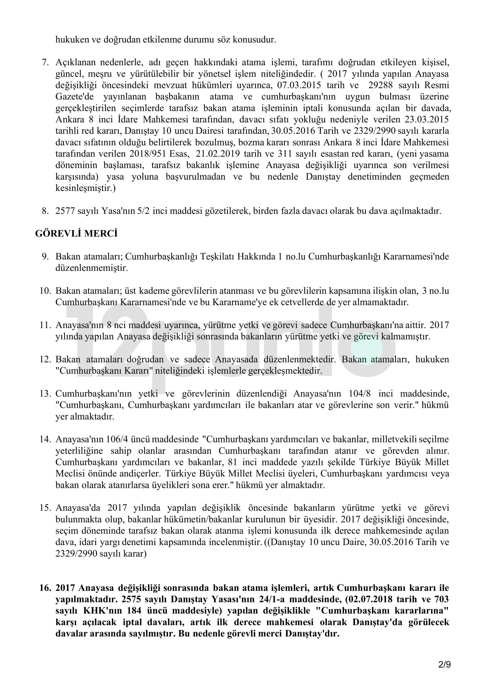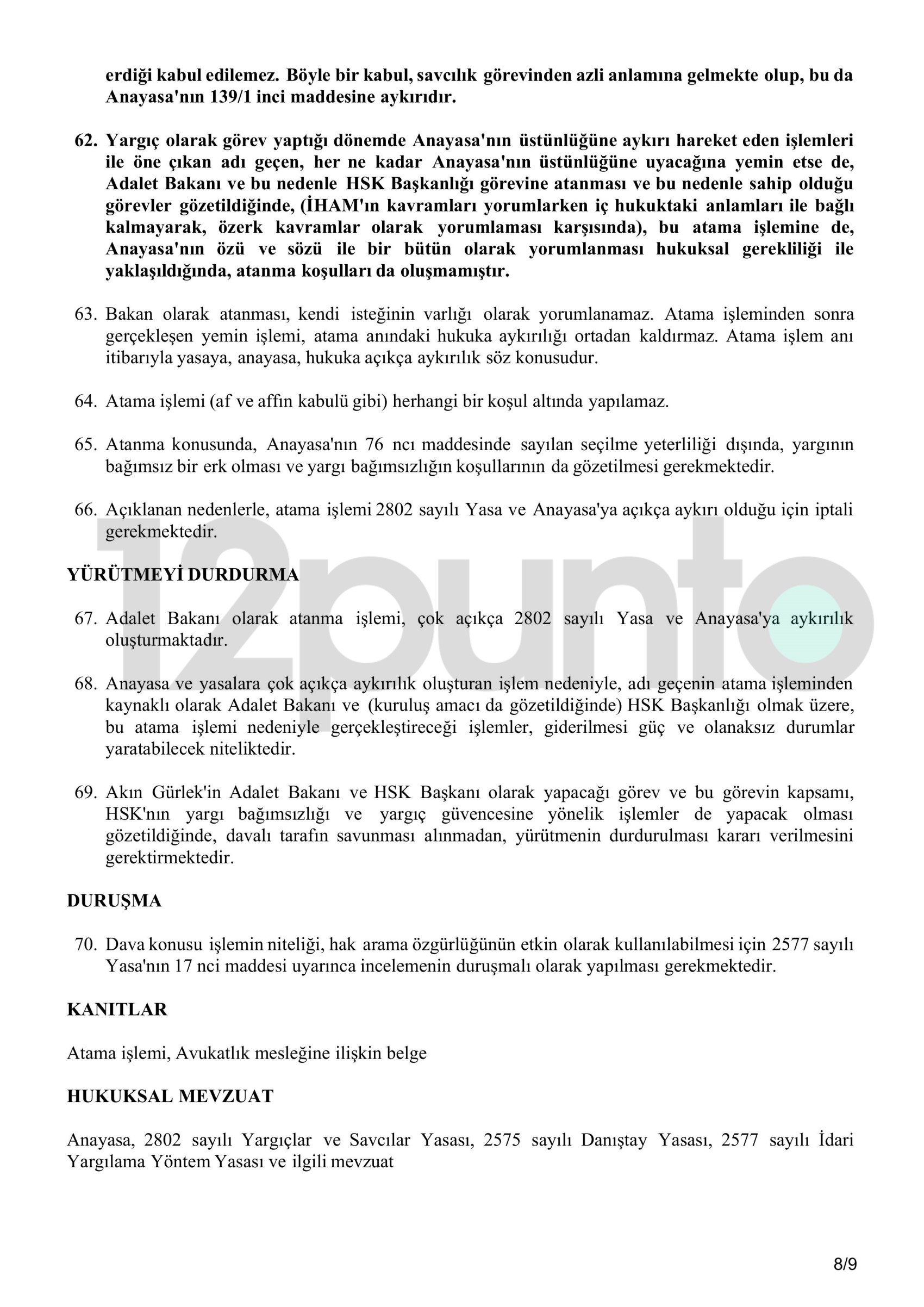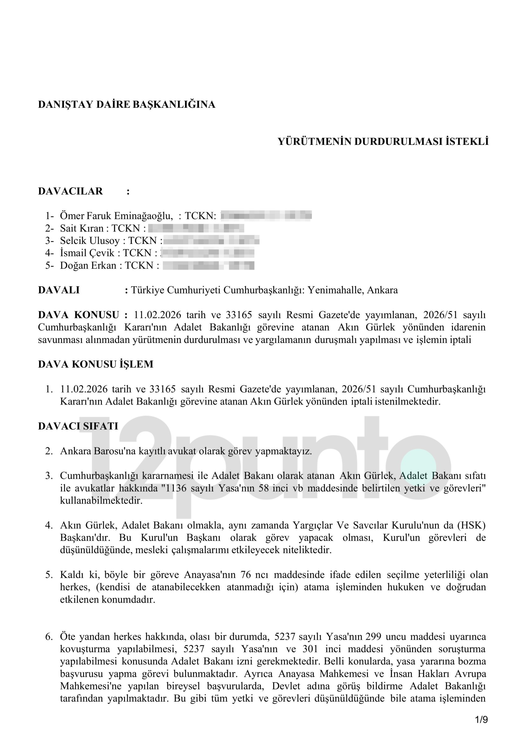 Kıran, “Akın Gürlek Anayasaya, yasalara açıkça aykırı biçimde Cumhurbaşkanı Kararı ile Adalet Bakanı olarak atanınca meslektaşımız YARSAV eski Genel Başkanı Ömer Faruk Eminağaoğlu'nun girişimiyle Danıştay'da ilgili işlemin iptaline yönelik dava açılması gündemimize geldi. 16 Şubat 2026 Pazartesi günü Ankara Barosu üyesi 5 avukat olarak dava açtık.” diyerek dava sürecini özetledi. Devamında ise “İstanbul Cumhuriyet Başsavcısı Akın Gürlek, 2802 sayılı Yargıçlar ve Savcılar Yasası uyarınca görevi devam ederken, 11.02.2006 tarihli Resmi Gazete yayımlanan 2026/51 sayılı Cumhurbaşkanlığı atama kararnamesi ile Adalet Bakanı olarak atanmıştır. Ancak Anayasa'nın 140/5 inci maddesinde, ‘Yargıçlar ve savcılar, yasada belirtilenlerden başka, resmi ve özel hiçbir görev alamazlar.’ hükmü yer almaktadır. Yine 2802 sayılı Yargıçlar ve Savcılar Yasası'nın 48/son maddesinde, ‘Yargıç ve savcılar, yasalarda belirlenenlerden başka, resmi ve özel hiçbir görev alamazlar, kazanç getirici faaliyetlerde bulunamazlar.’ hükmü yer almaktadır. Anayasa hükmü gereğince, yargıçlık ve savcılık görevi devam ederken, yargıç ve savcılar, 2802 sayılı yasadaki kadro cetvellerinde gösterilen görevlerden veya anılan yasada yer alan görevlerindışında başka bir göreve atanamazlar. Akın Gürlek, savcılık görevinden çekilmeden, çekilmiş sayılmadan ya da bu görevi ‘iradi olarak’ sona ermeden Adalet Bakanı olarak atanmıştır. Bakanlık görevi, yemin işleminden önce, atanma anı itibarıyla başlayacaktır. Bu yönüyle, savcılık görevi sona ermeden Akın Gürlek'in bakan olarak atanması işlemi, Anayasa'nın 140/5, 2802 sayılı Yasa'nın 48/son maddelerine açıkça aykırıdır.”