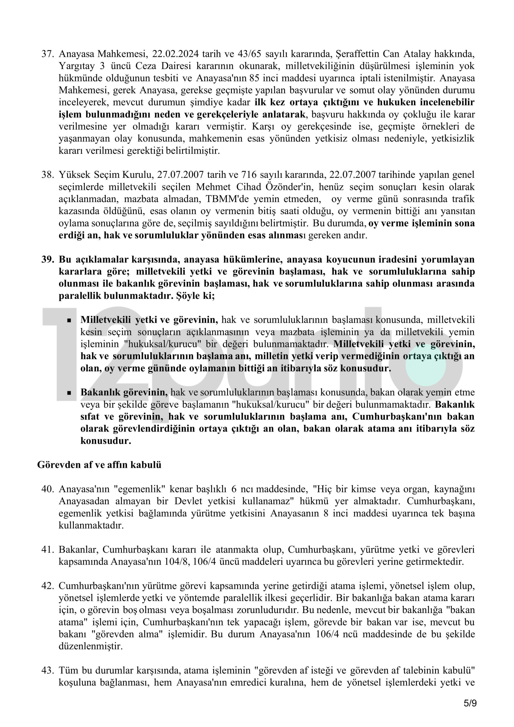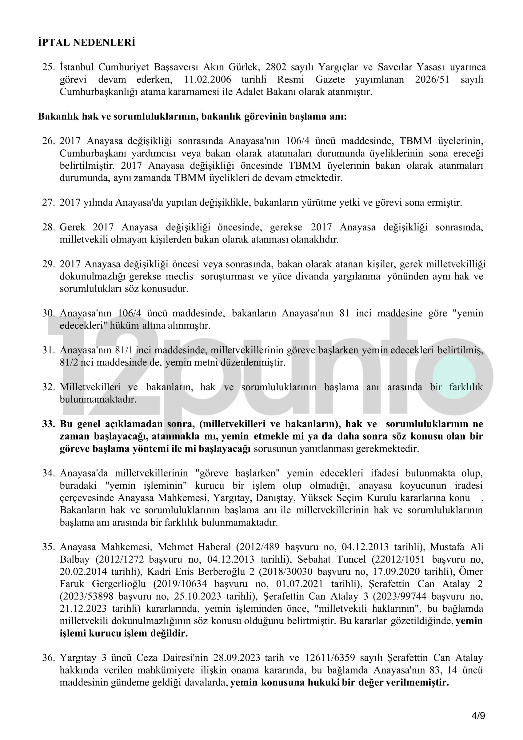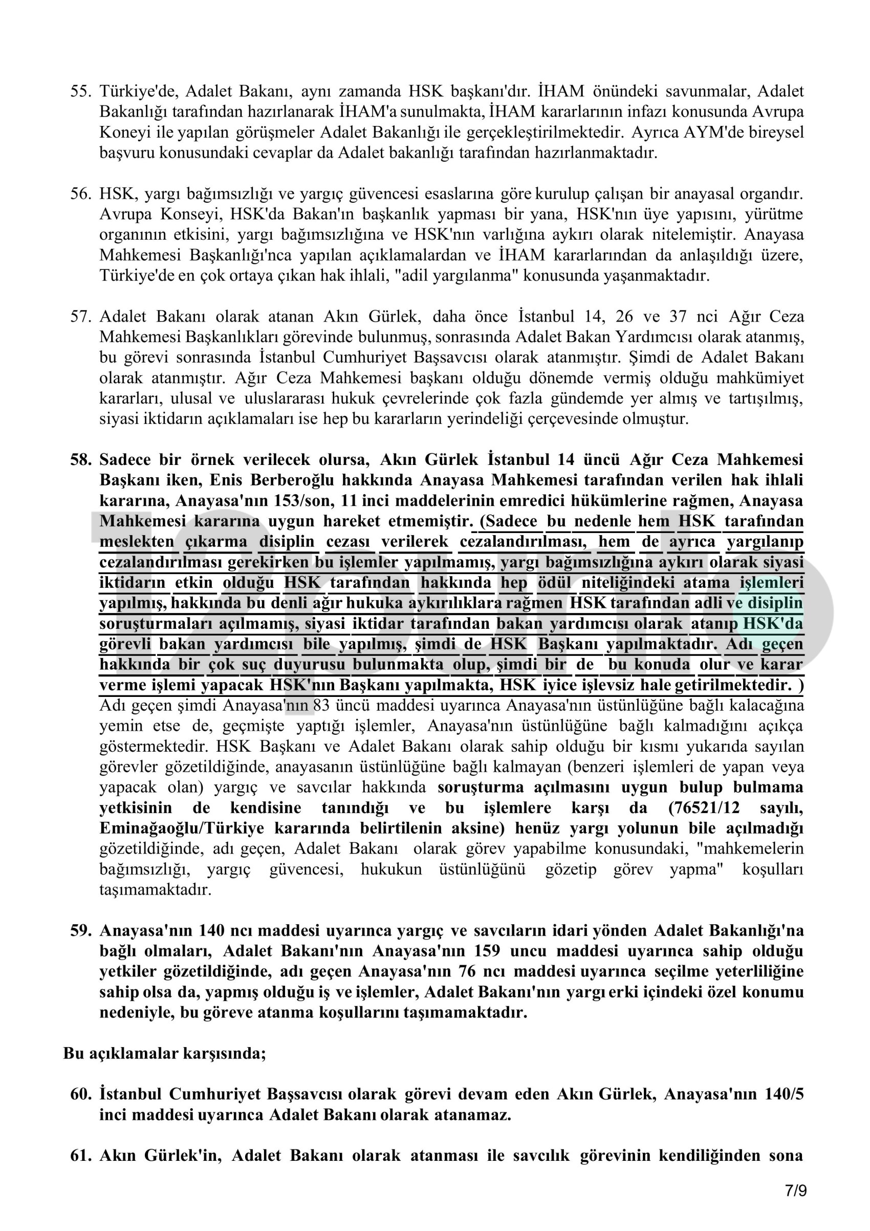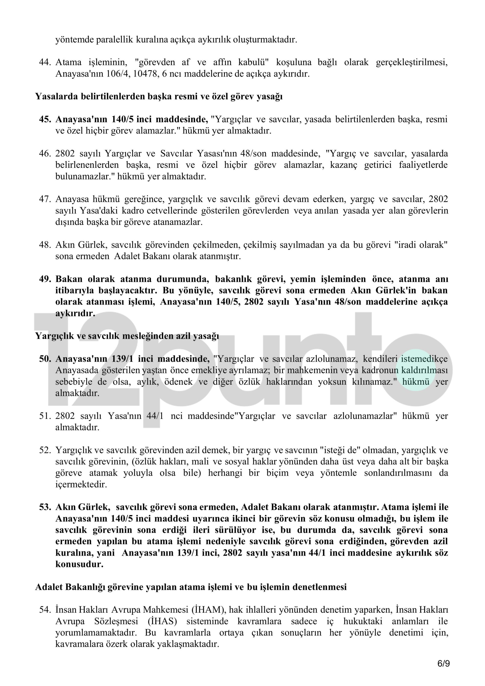 Kıran açıklamalarına şöyle devam etti: “Akın Gürlek, savcılık görevi sona ermeden, Adalet Bakanı olarak atanmıştır. Atama işlemi ile Anayasa'nın 140/5 inci maddesi uyarınca ikinci bir görevin söz konusu olmadığı, bu işlem ile savcılık görevinin sona erdiği ileri sürülüyor ise, bu durumda da, savcılık görevi sona ermeden yapılan bu atama işlemi nedeniyle savcılık görevi sona erdiğinden, görevden azil kuralına, yani Anayasa'nın 139/1 inci, 2802 sayılı yasa'nın 44/1 inci maddesine aykırılık söz konusudur.
