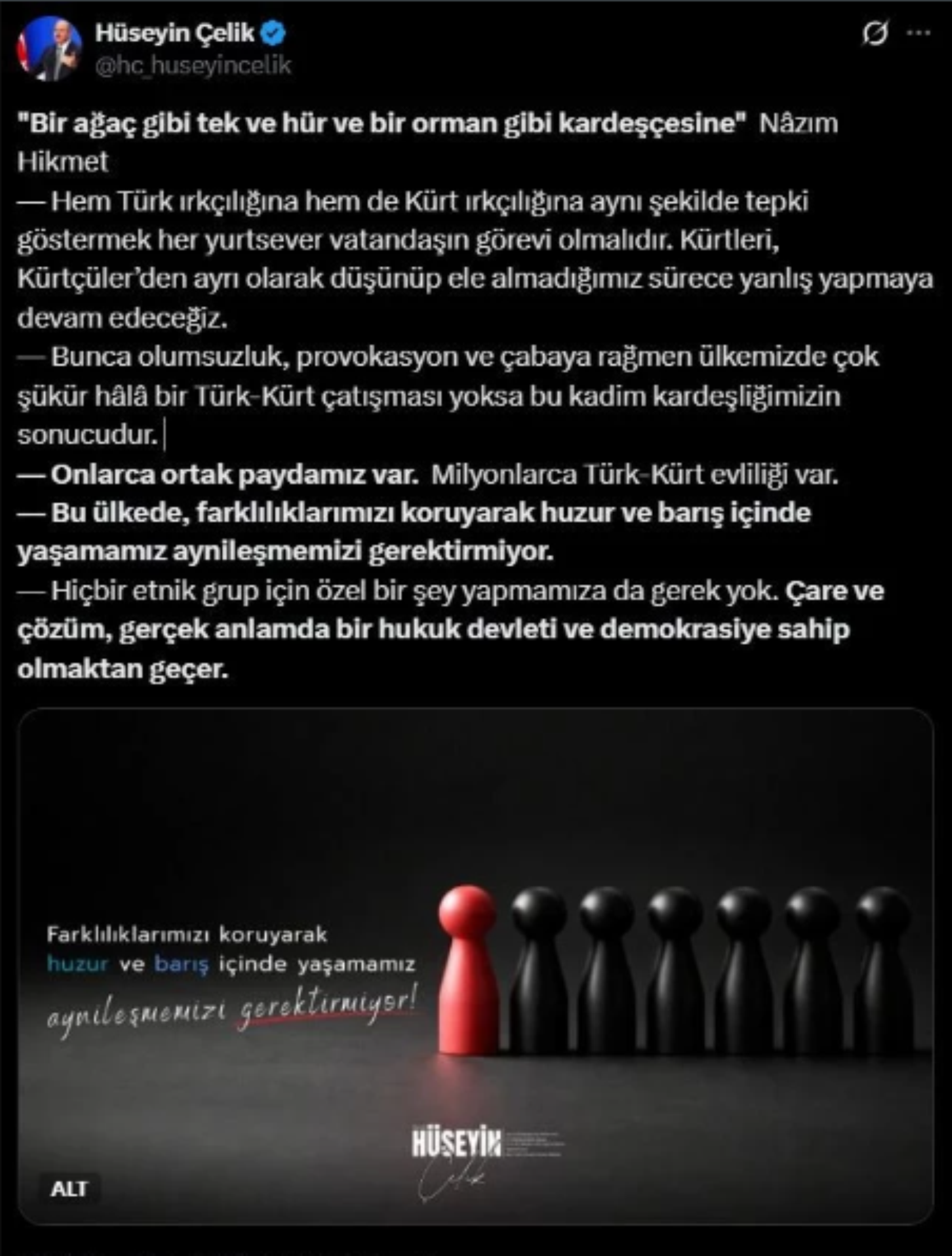 Ülkemizde Milyonlarca Türk-Kürt evliliği olduğunun altını çizen Çelik, “Bu ülkede, farklılıklarımızı koruyarak huzur ve barış içinde yaşamamız aynileşmemizi gerektirmiyor. Hiçbir etnik grup için özel bir şey yapmamıza da gerek yok. Çare ve çözüm, gerçek anlamda bir hukuk devleti ve demokrasiye sahip olmaktan geçer” ifadelerini kullandı.