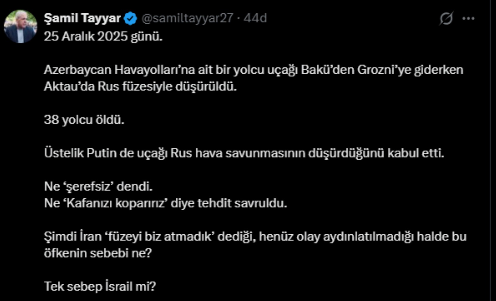 Azerbaycan Havayolları’na ait bir yolcu uçağı Bakü’den Grozni’ye giderken Aktau’da Rus füzesiyle düşürüldü.