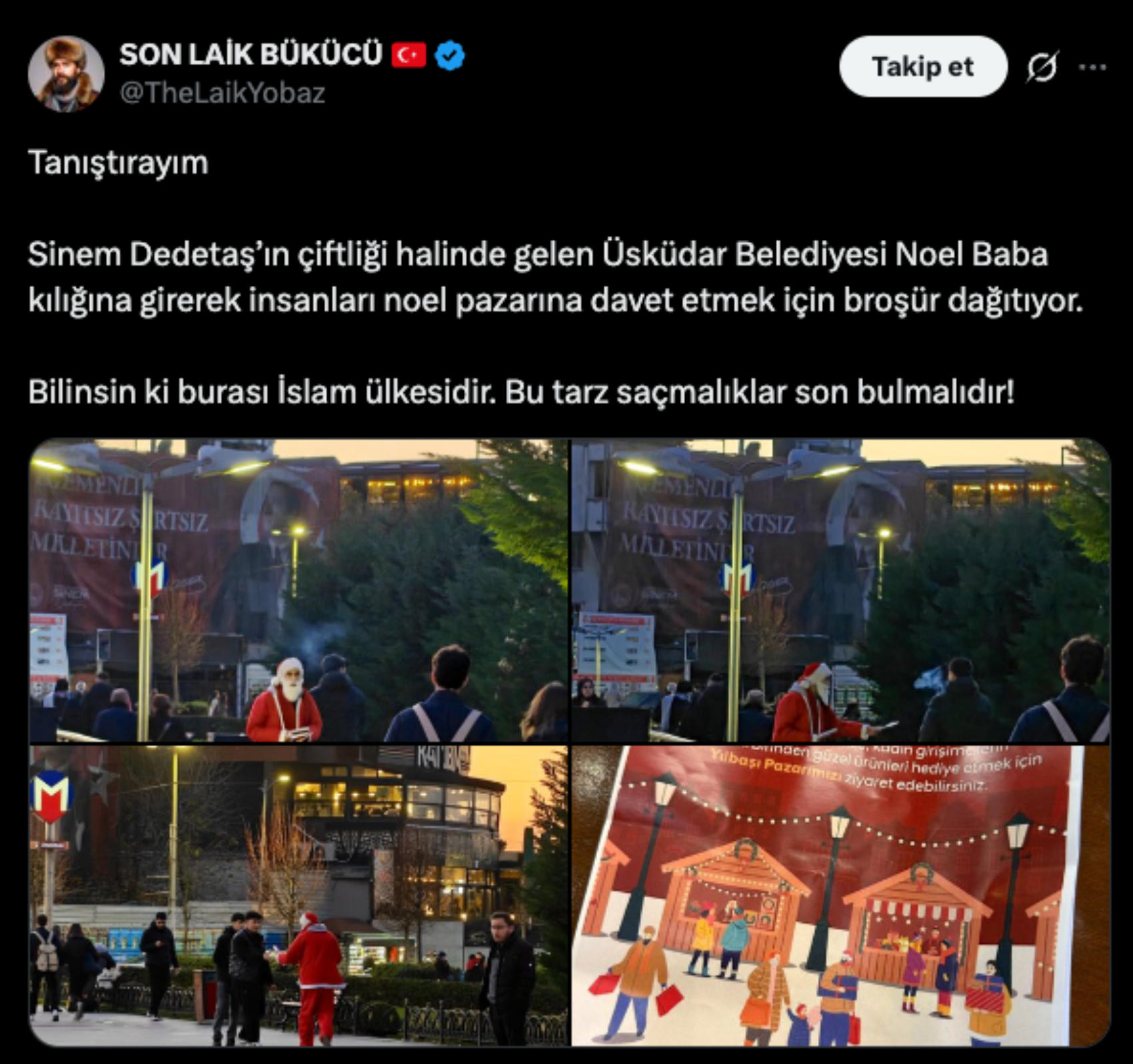 Bir hesap, Üsküdar Belediyesi’nin bir çalışanına Noel Baba kostümü giydirip belediye adına Kadın Emeği Pazarı’na davet etmek broşür dağıttığını öne sürdü.