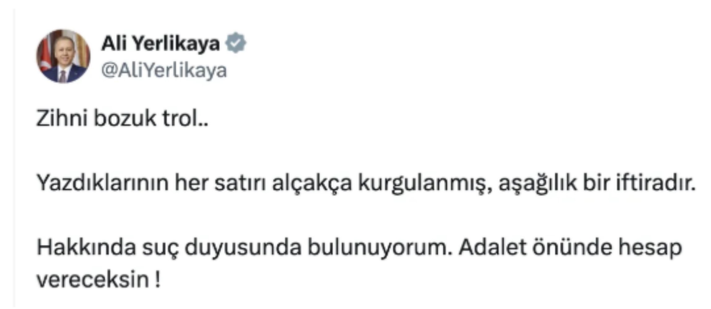 Eski İçişleri Bakanı Ali Yerlikaya ise iddiaları yalanladı. Sosyal medya üzerinden açıklama yapan Yerlikaya, "Zihni bozuk trol... Yazdıklarının her satırı alçakça kurgulanmış, aşağılık bir iftiradır. Hakkında suç duyusunda bulunuyorum. Adalet önünde hesap vereceksin" ifadelerini kullandı.