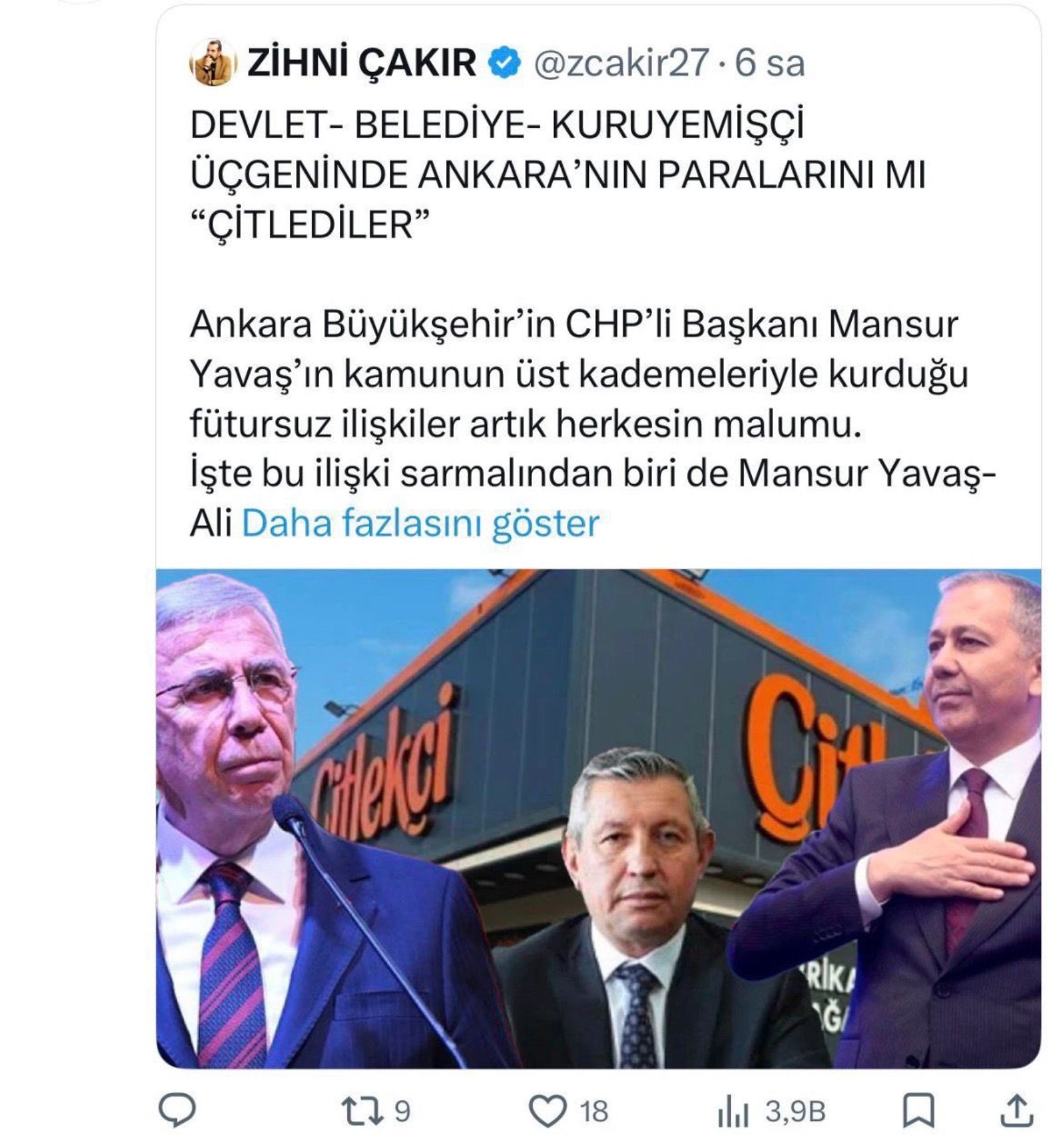 Zihni Çakır, bir başka paylaşımında "Devlet - belediye - kuruyemişçi üçgeninde Ankara'nın paralarını mı çitlediler? Ankara'nın CHP'li Belediye Başkanı Mansur Yavaş'ın kamunun üst kademeleriyle kurduğu fütursuz ilişkiler herkesin malumu" dedi. Çakır, Yavaş ve Yerlikaya arasında da maddi çıkar ilişkisi olduğunu ve imar için ricada bulunduğunu iddia etti.