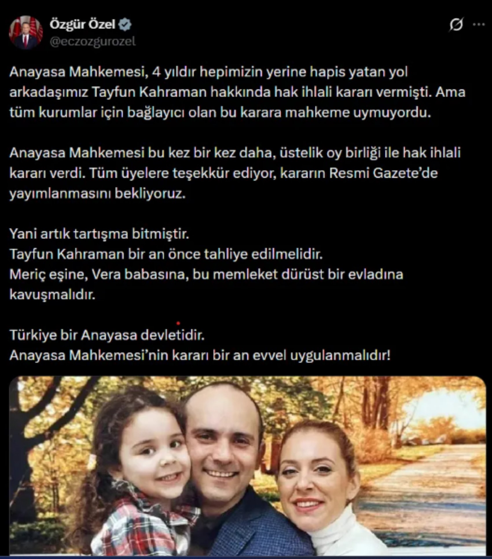 Kahraman'ın dört yıldır hapis yattığını vurgulayan Özel, eşi Meriç ve kızı Vera'ya kavuşması gerektiğini belirterek şu ifadeleri kullandı:
