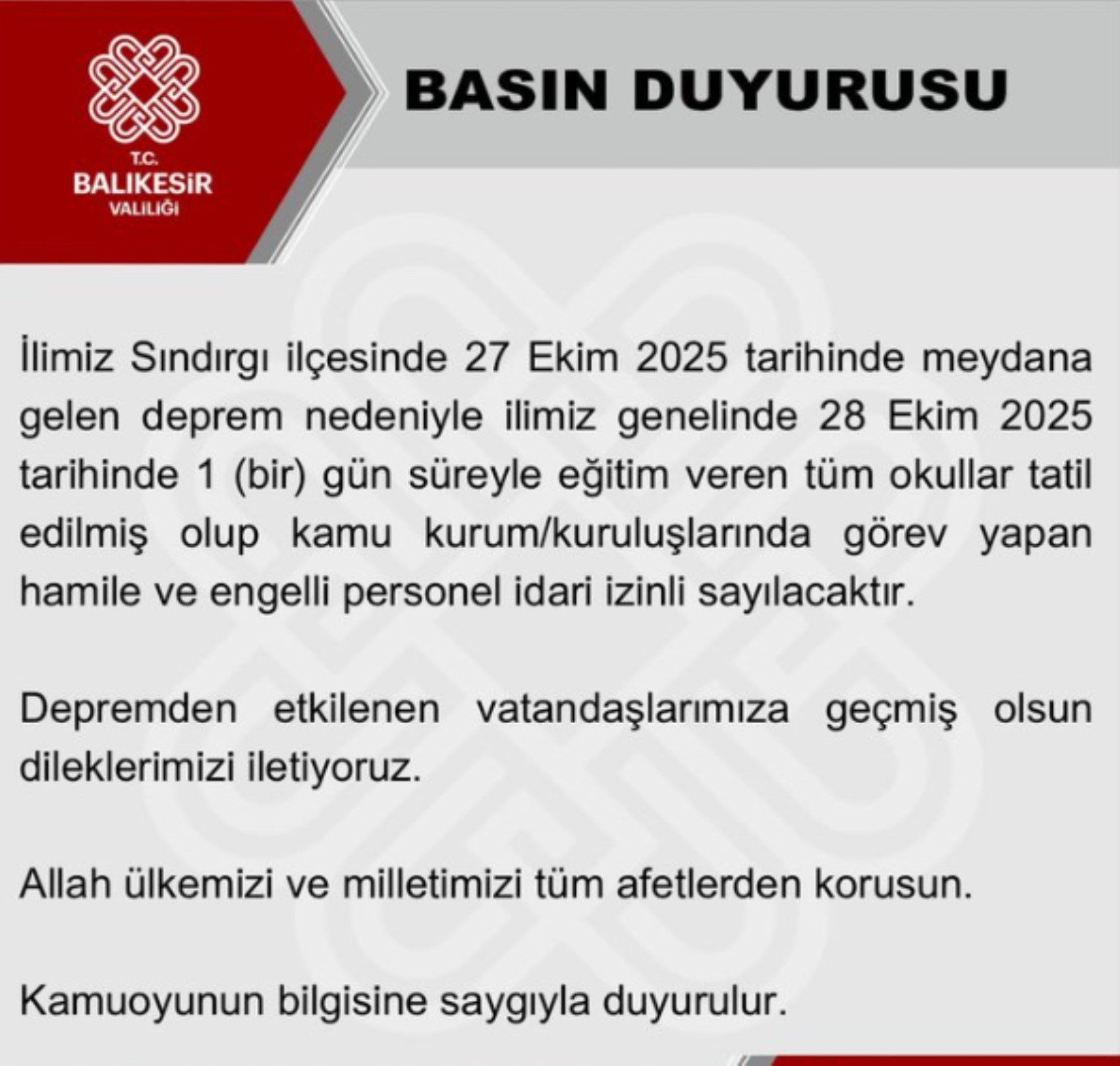 Balıkesir Valiliği, Sındırgı'da meydana gelen 6.1 büyüklüğündeki deprem sebebiyle bugün il genelinde okulların tatil edildiğini, kamuda görev yapan engelli ve hamile personellerin bir gün idari izinli sayılacağını duyurdu.