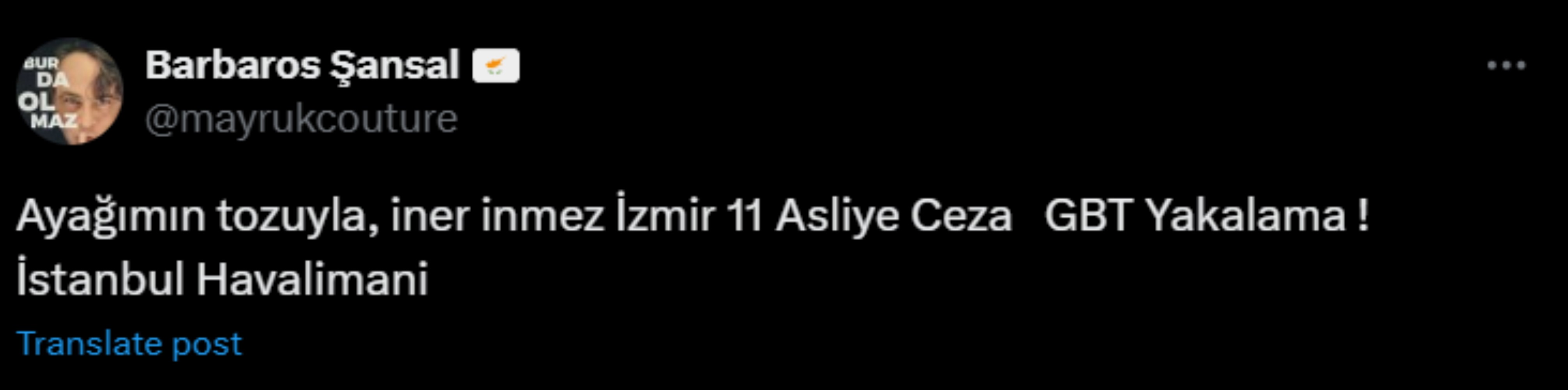 Ünlü modacı Barbaros Şansal, İzmir 11. Asliye Ceza Mahkemesi'nin kararıyla İstanbul Havalimanı'nda gözaltına alındığını duyurdu. Şansal, sosyal medya hesabından "Ayağımın tozuyla, iner inmez İzmir 11 Asliye Ceza GBT Yakalama" paylaşımı yaptı.